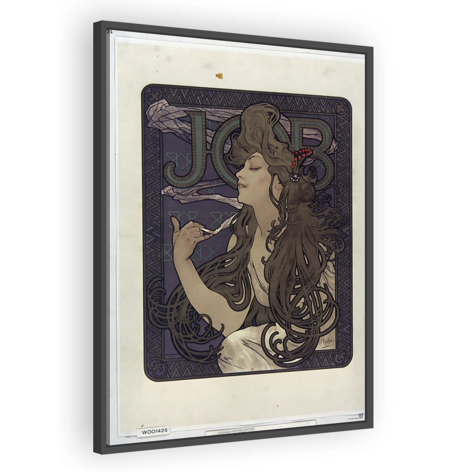 Alphonse Mucha's 1896 advertisement for Job cigarettes exemplifies the Art Nouveau style—ornate linework, elegant female figure and decorative typography—bridging fine art and commercial poster design...