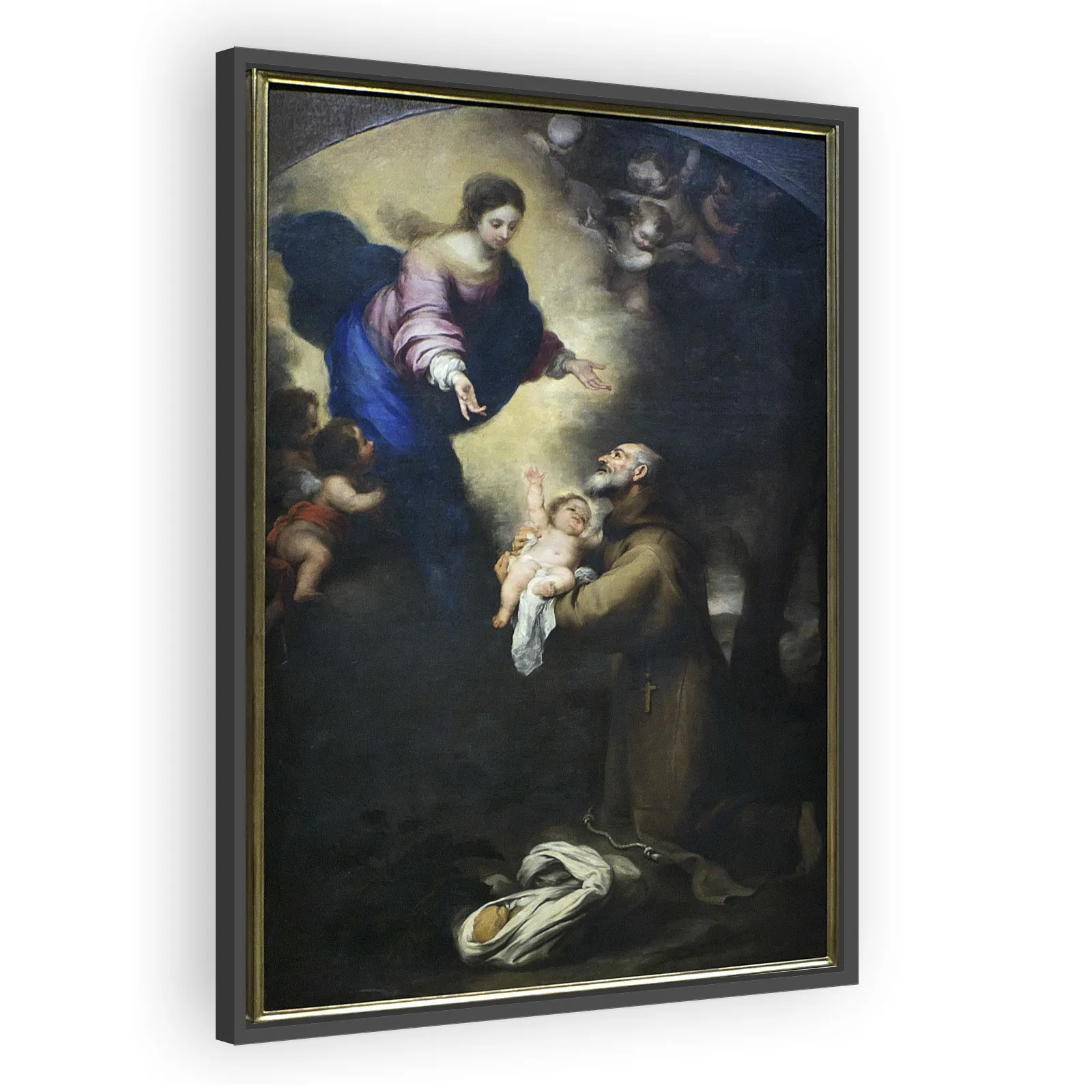 Masterful 17th-century Baroque work by Bartolomé Esteban Murillo, showing San Félix Cantalicio thanking the Virgin for the gift of the Child. A luminous devotional image from the Museo de Bellas Artes...