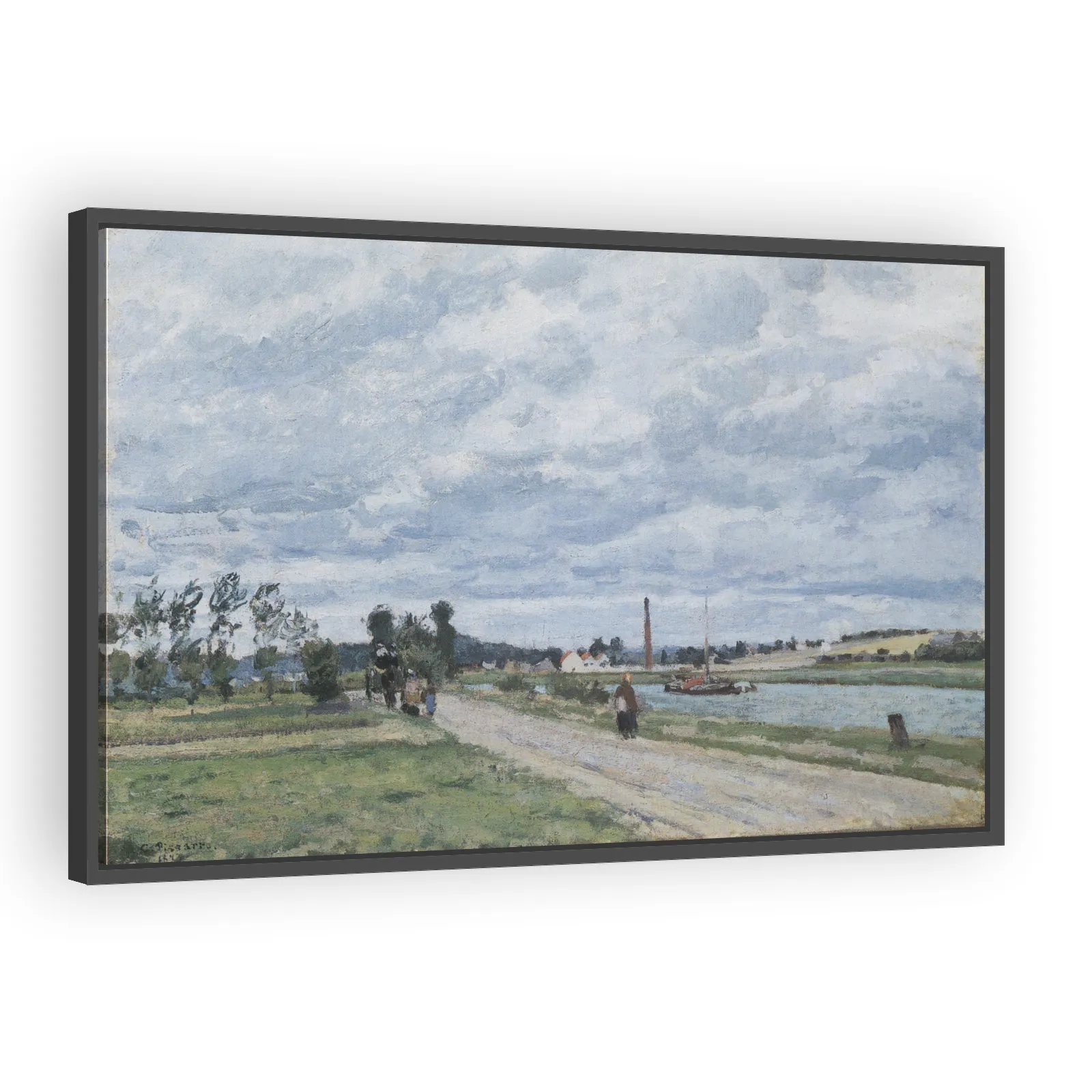 Camille Pissarro’s 1873 depiction of the Oise near Pontoise captures the shifting light, wind-swept clouds, and everyday riverside life with the loose brushwork and luminous color that define Impressi...