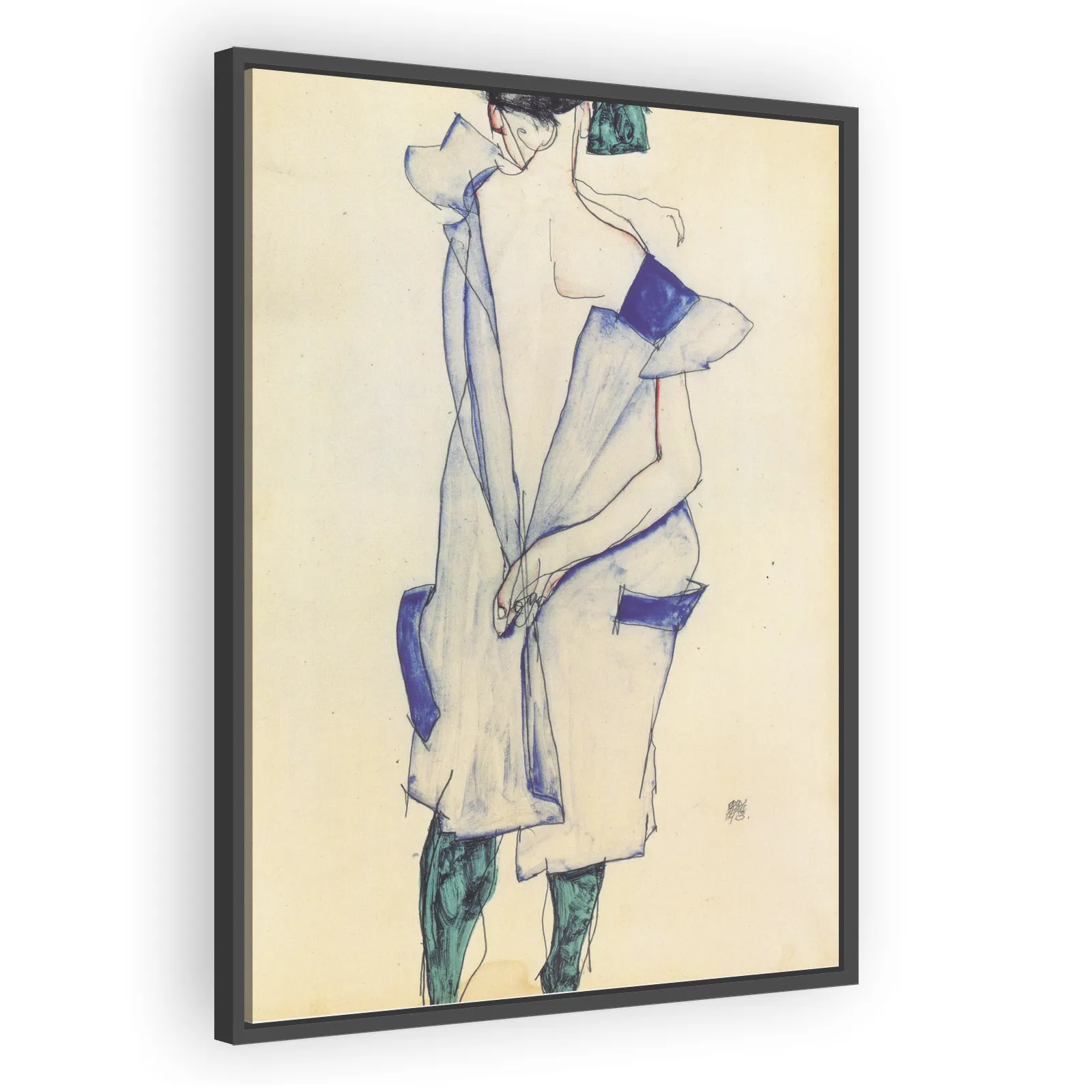 Egon Schiele's 1913 study, Rückenansicht eines Mädchens im blauen Rock, captures his incisive line and psychological intensity. The restrained palette and direct composition make it a compelling examp...