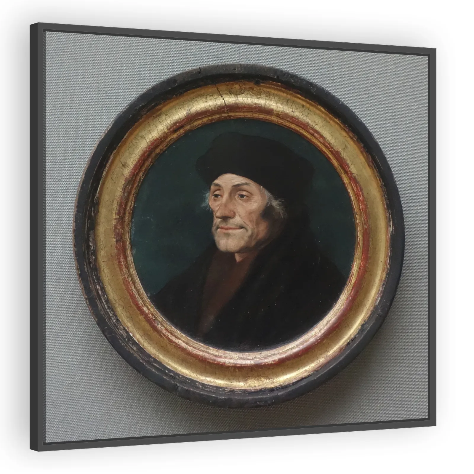 A compact roundel portrait of Desiderius Erasmus by Hans Holbein the Younger (1532). The intimate, concentrated likeness captures the scholar’s intellect and calm dignity—an appealing historic image f...