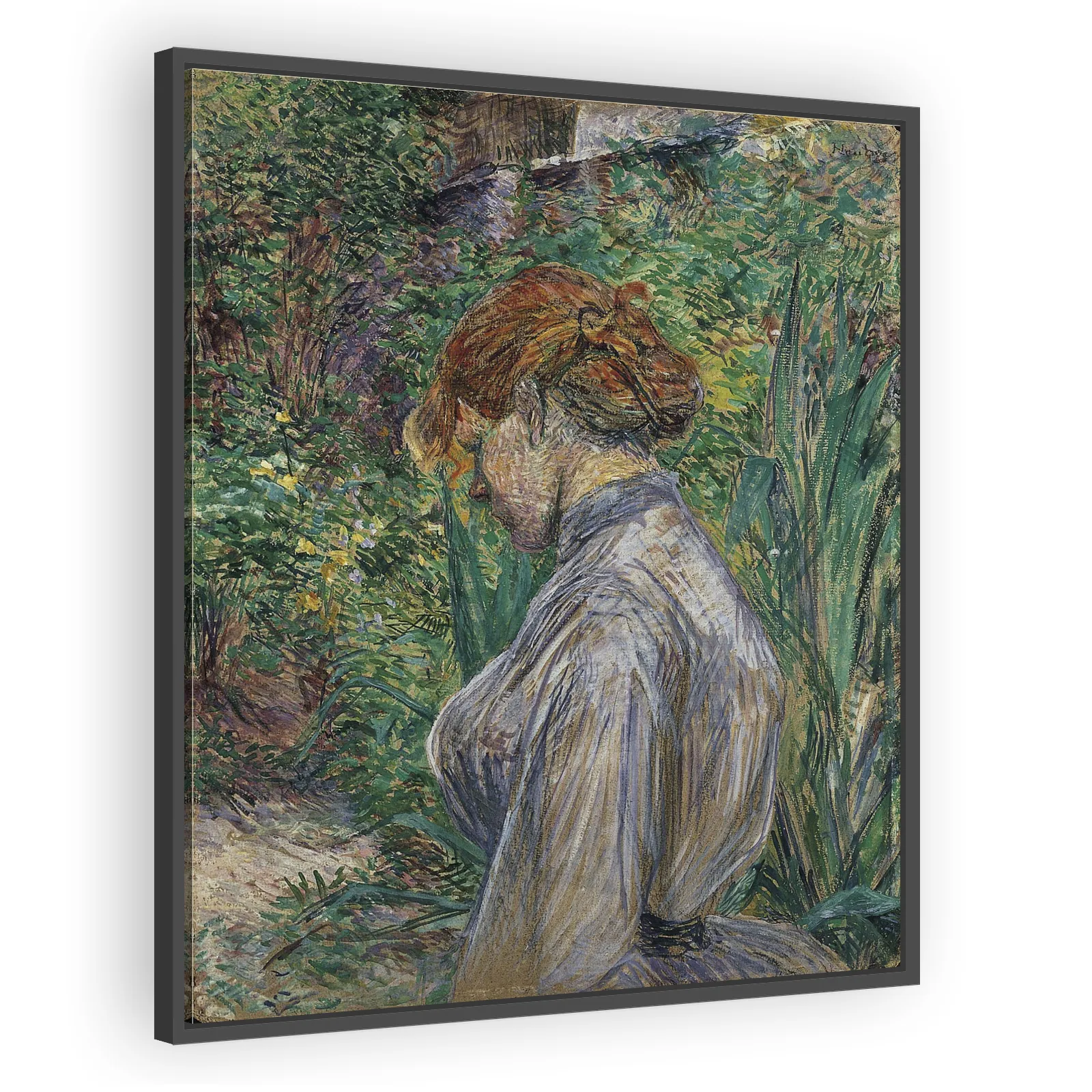 An intimate 1887 portrait by Henri de Toulouse-Lautrec capturing a red-headed woman in a lush garden. Noted for its loose brushwork and psychological depth, the work combines realism and Post-Impressi...