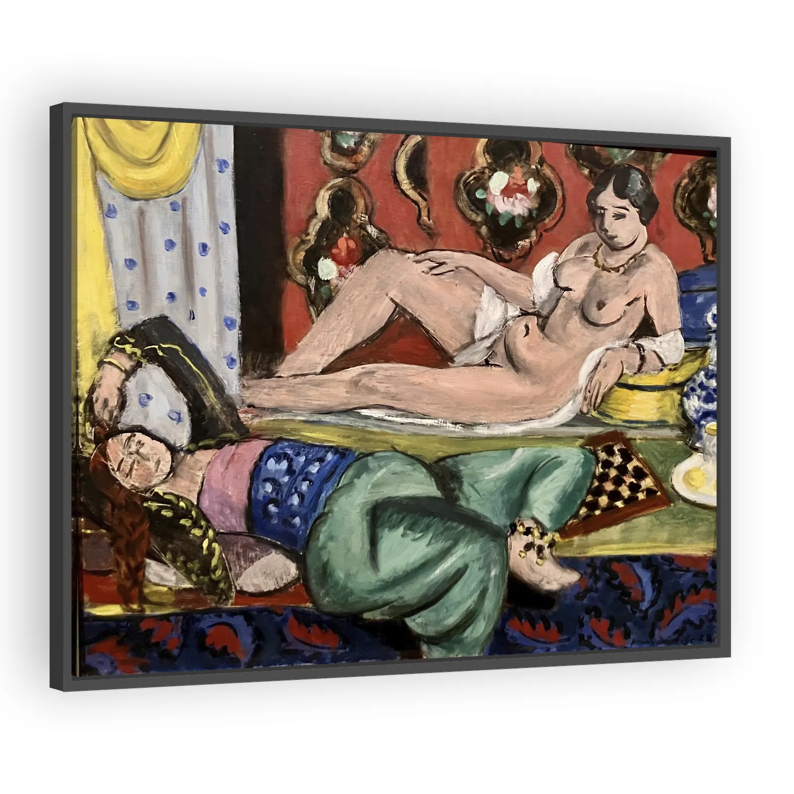A 1928 canvas by Henri Matisse, this intimate composition pairs reclining odalisques with rich ornamental patterning and a checkerboard floor. The work exemplifies Matisse’s late decorative modernism—...
