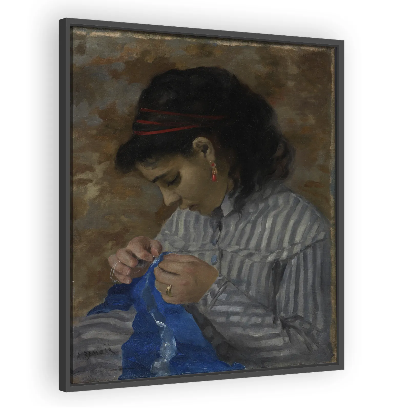 Pierre-Auguste Renoir’s 1867 portrait 'Lise Sewing' captures intimate domesticity with luminous color and fluid brushwork. A tender study of a young woman at work, it exemplifies Renoir’s early move toward light, warmth, and modern life—ideal for collectors and admirers of 19th‑century French painting.