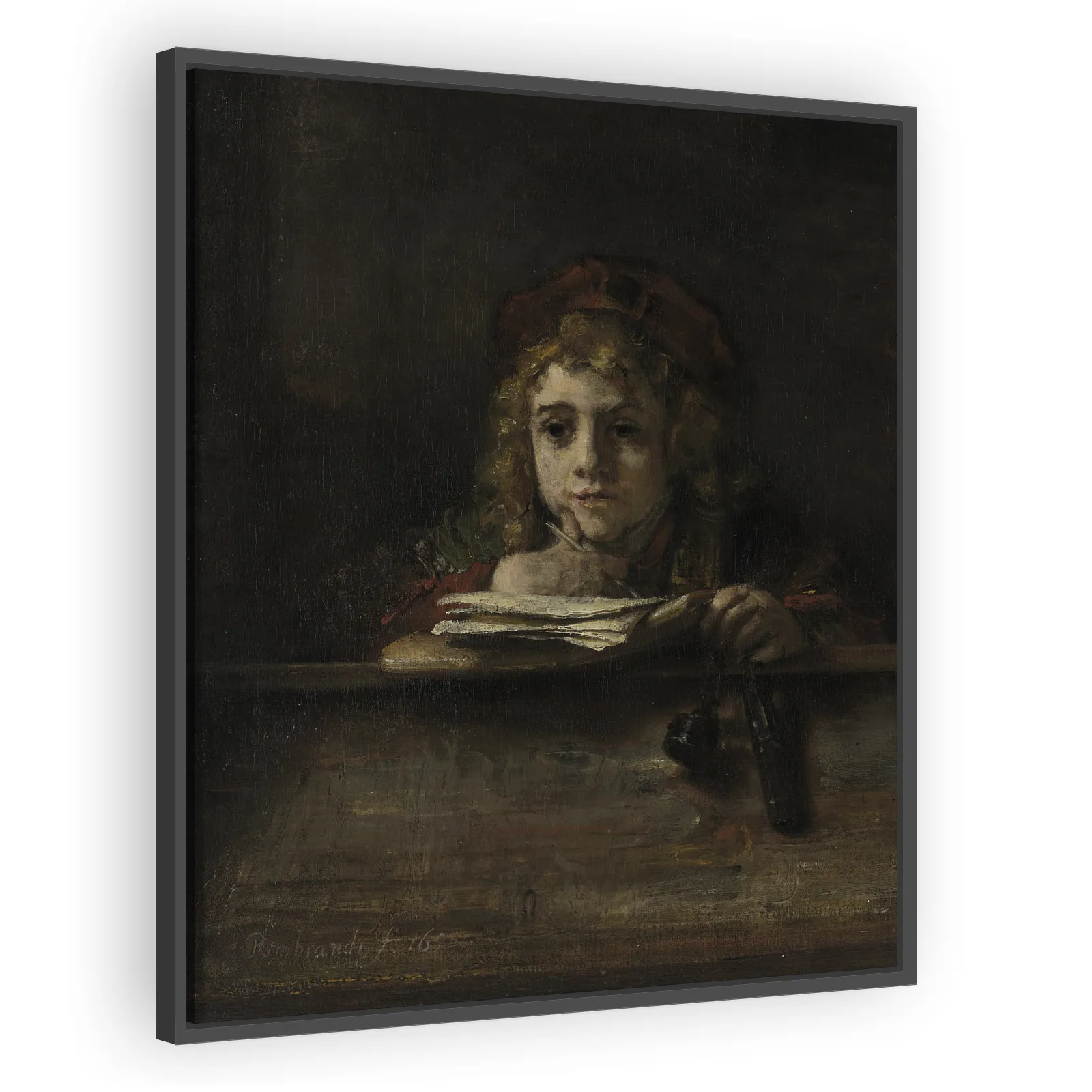 A contemplative portrait of Titus van Rijn (1641–1668), Rembrandt’s son, rendered with the artist’s characteristic intimacy, dramatic light, and textured brushwork — a poignant study in youth and dome...