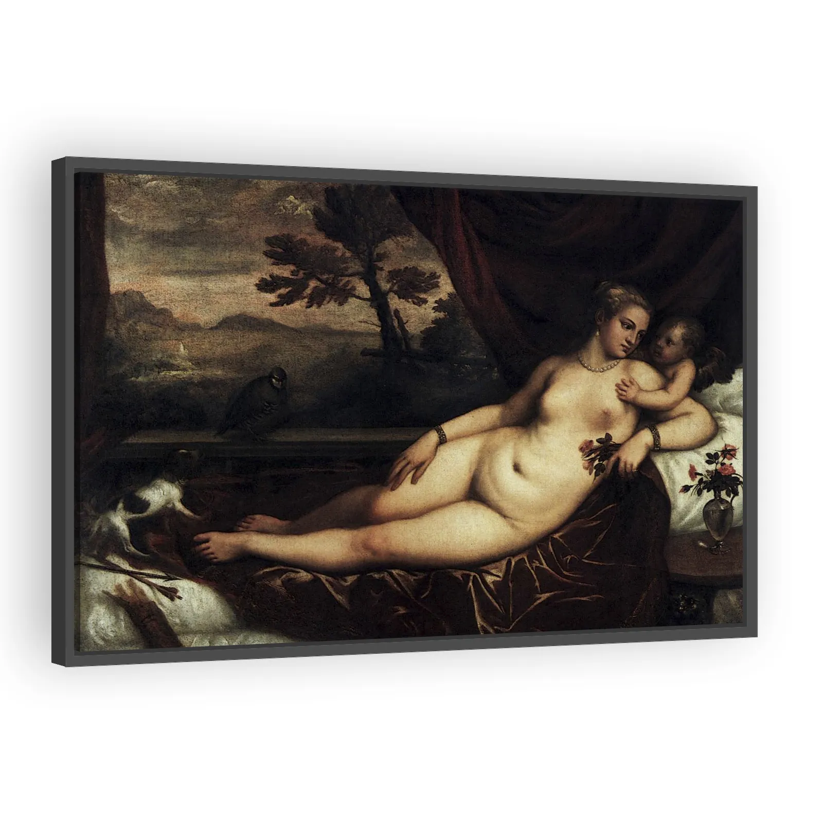 A seductive Renaissance depiction of Venus and Cupid by Titian (c.1550), exemplifying Venetian color, sensuous form, and mythological storytelling. Housed in the Uffizi Gallery, this work captures the...