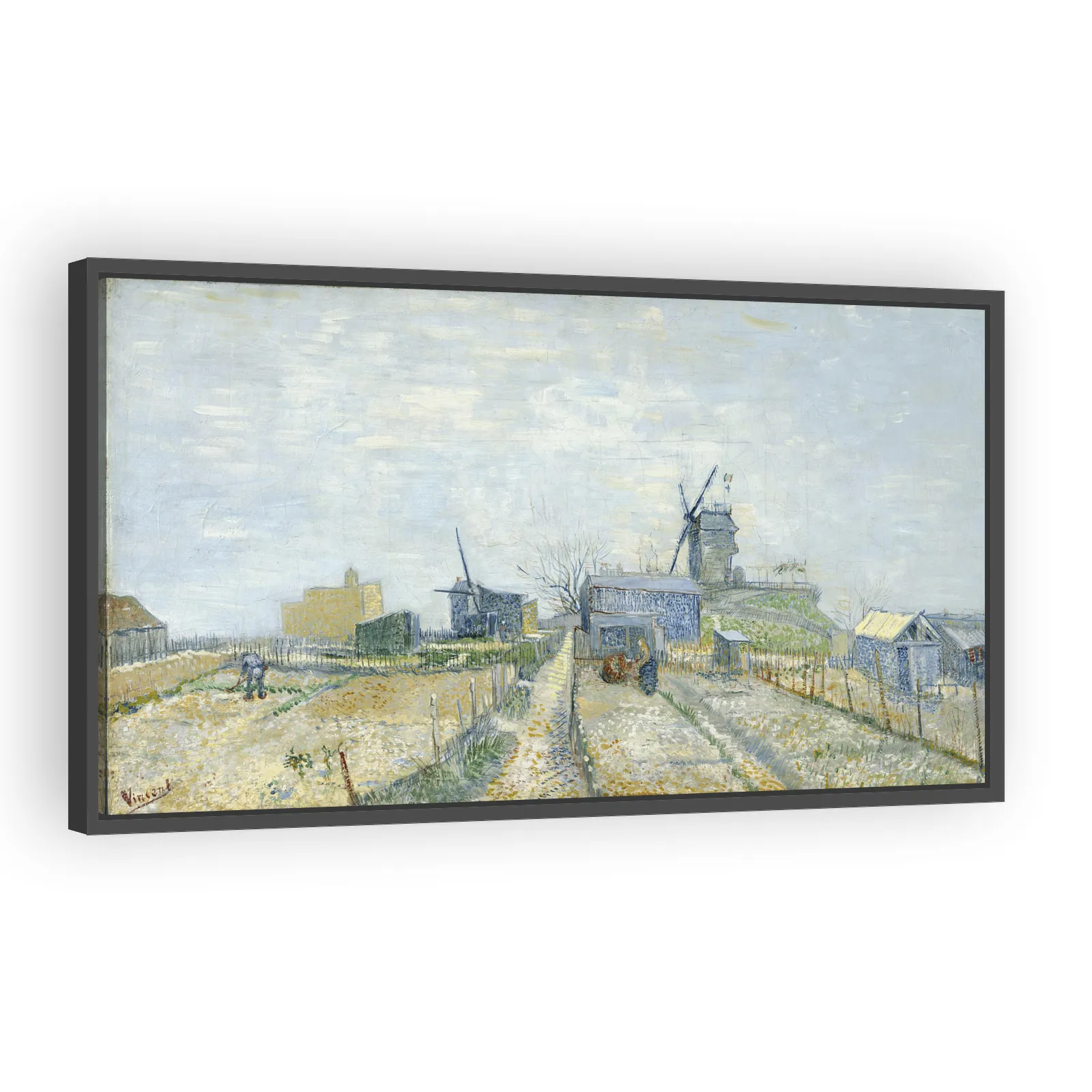 A vibrant 1887 view of Montmartre by Vincent van Gogh, capturing windmills, terraced vegetable plots, and the shifting urban landscape. Bold brushwork and vivid color reflect Van Gogh’s Paris period,...