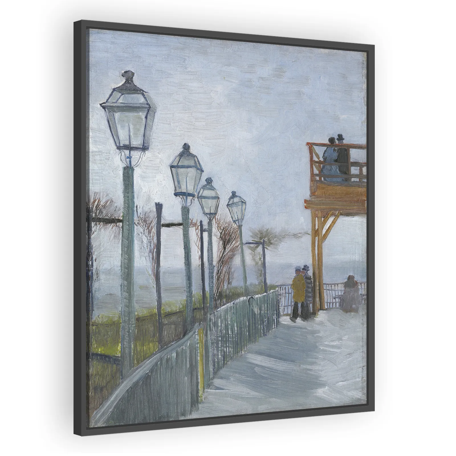 A vibrant Montmartre scene by Vincent van Gogh (1887), capturing the terraces and observation platform near the Moulin de Blute-Fin. Rich brushwork and bold color express urban energy and the artist’s...