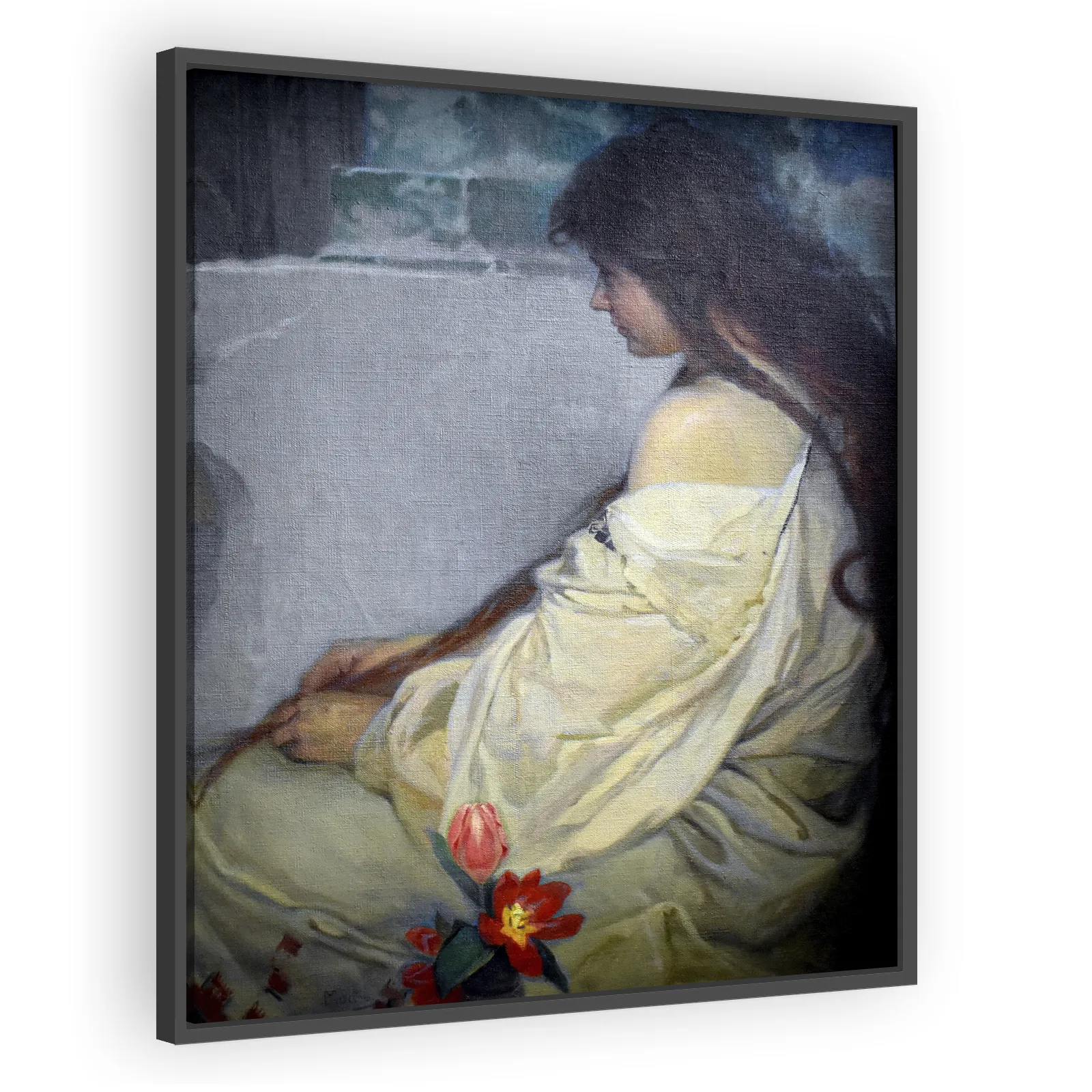Alfons Mucha’s 1920 oil painting 'Girl with Loose Hair and Tulips' blends graceful Art Nouveau lines and soft color into a lyrical portrait. Ideal for collectors who appreciate decorative elegance, fl...