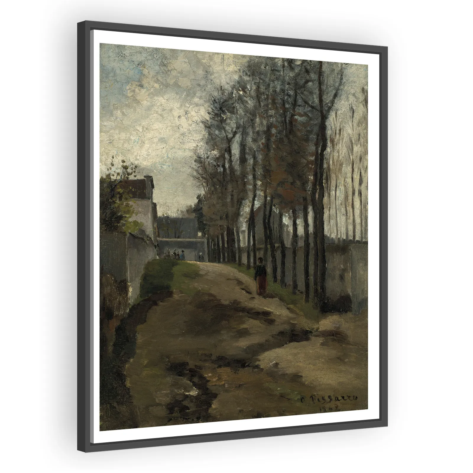 A serene winter landscape by Camille Pissarro (1862), capturing quiet rural atmosphere and early Impressionist sensibilities. Subtle tonal harmonies and a measured composition make this work appealing...