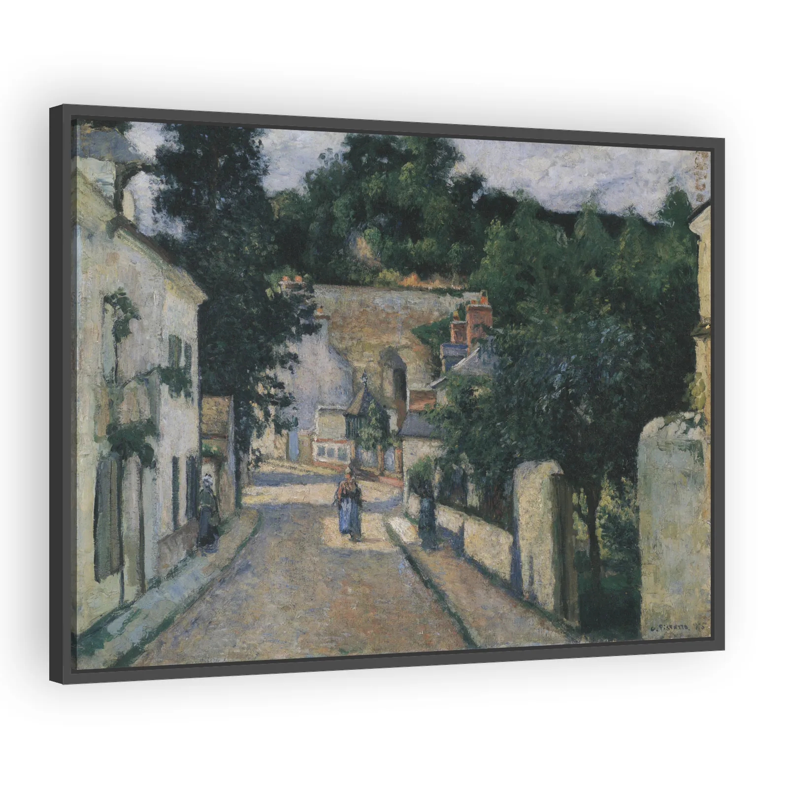 An 1875 street view by Camille Pissarro capturing daily life in Pontoise with loose brushwork, luminous atmosphere, and the immediacy of Impressionism—an evocative study in light, perspective, and mod...