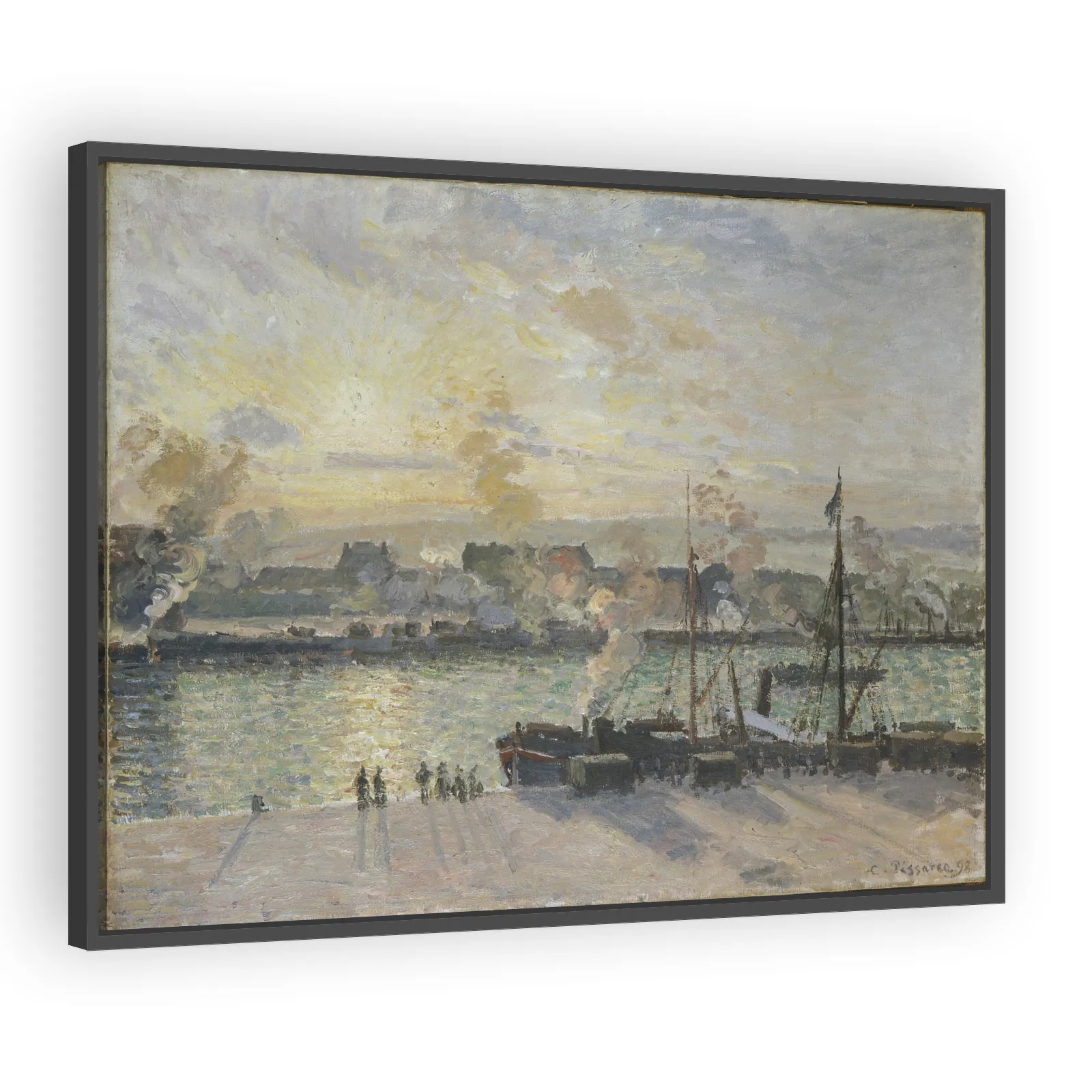 Camille Pissarro’s 1898 port scene captures Rouen’s industrial waterfront at dusk, blending Impressionist light, loose brushwork, and maritime atmosphere—an evocative study of modern life and riversid...