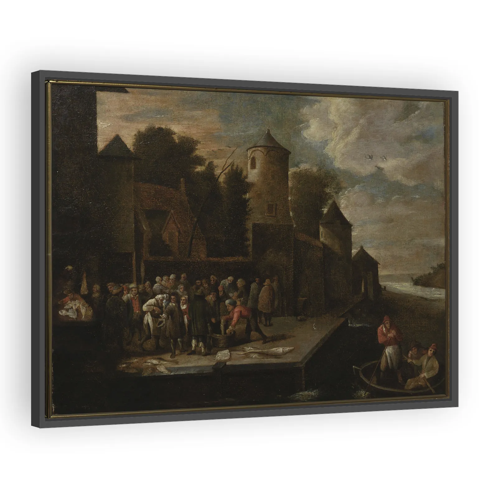 A lively Flemish Baroque genre scene by David Teniers the Younger, showing bustling port commerce and everyday life. Rich in detail and atmospheric light, it appeals to collectors of 17th-century genre painting and maritime scenes.