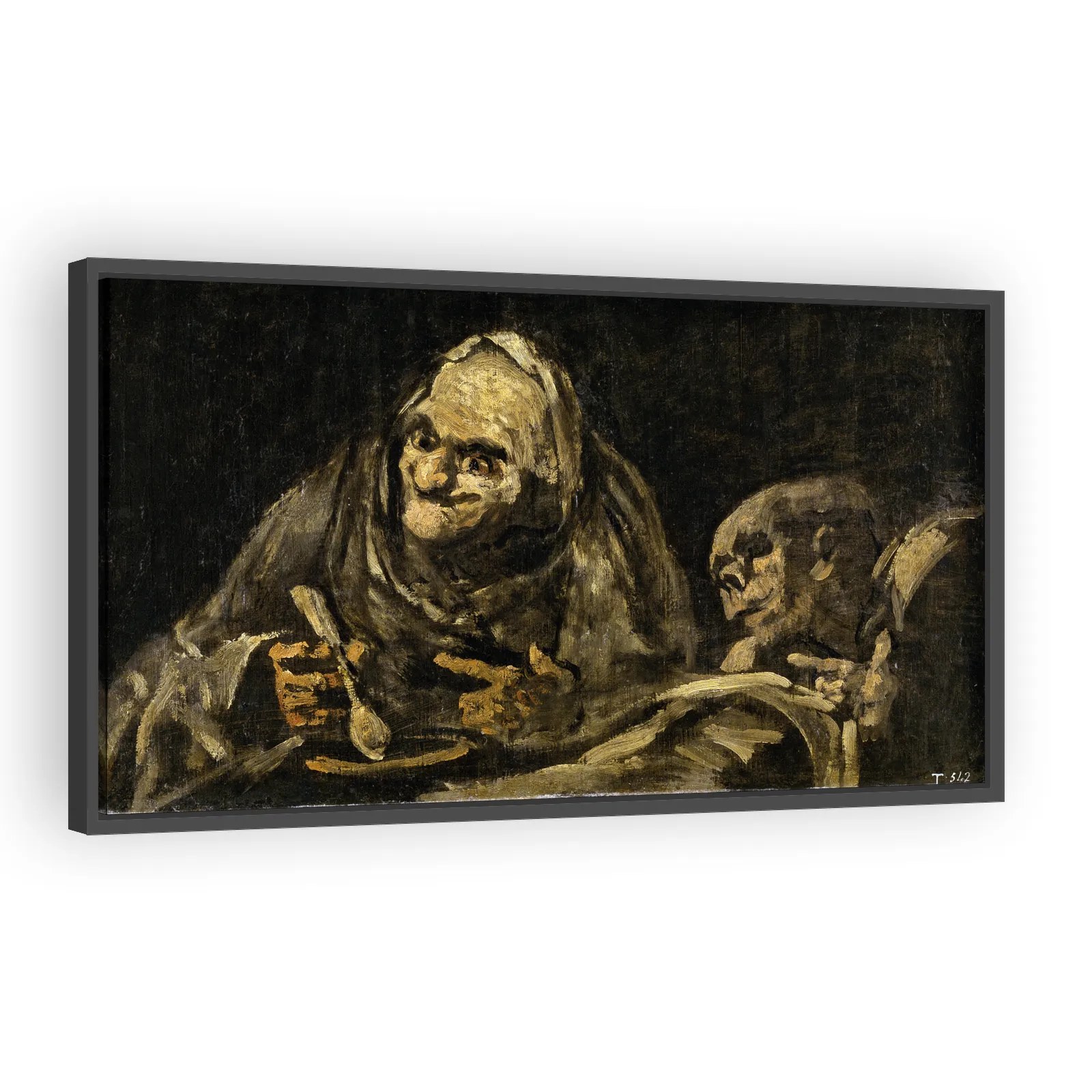 A candid scene by Francisco Goya (1820) depicting two elderly men sharing a humble meal. Oil originally painted on a wall and later transferred to canvas, the work combines stark realism with psycholo...