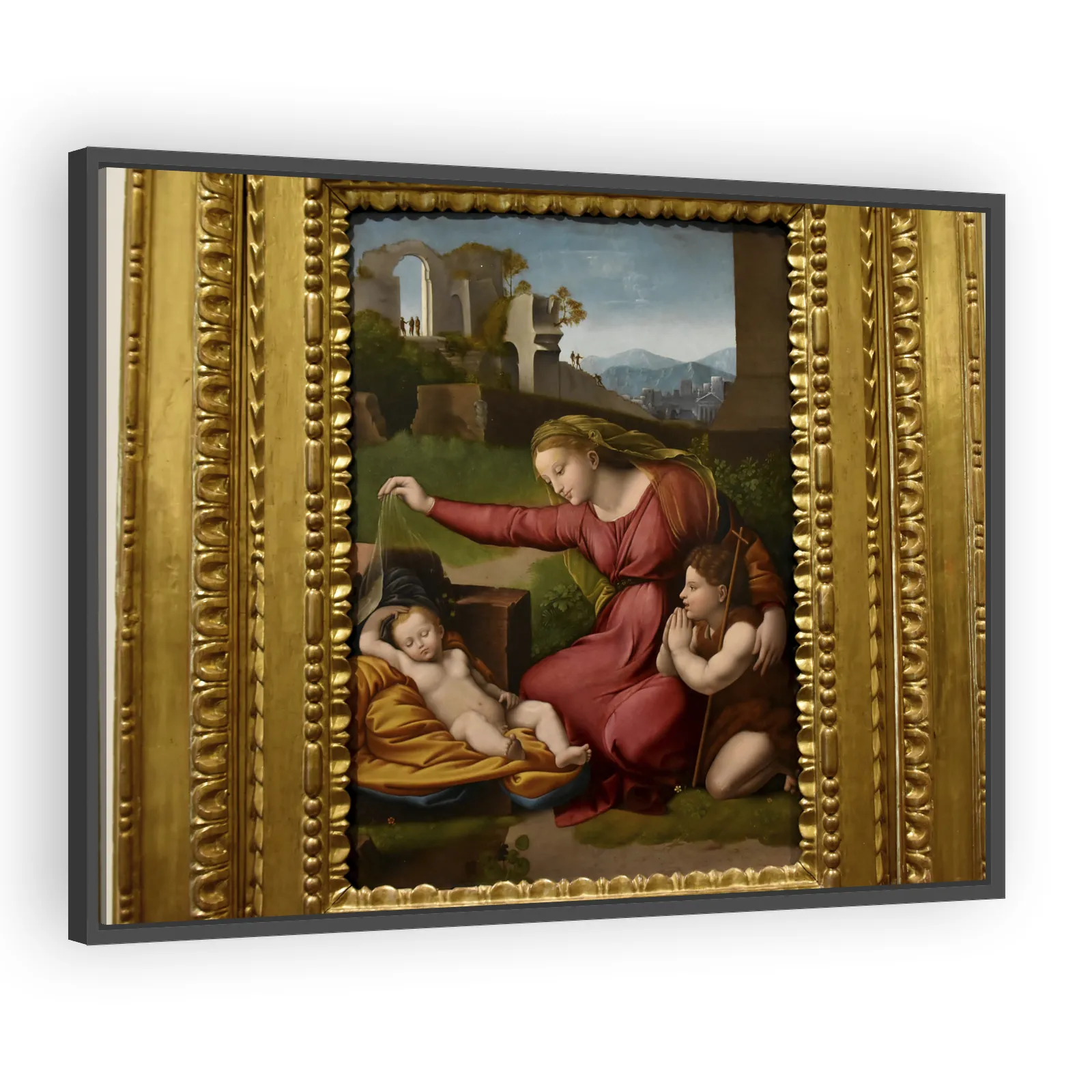 A Renaissance devotional composition attributed to Raphael, the Virgin and Child with Saint John (Madonna of the Veil) combines tender figuration, balanced composition, and soft sfumato—an intimate im...