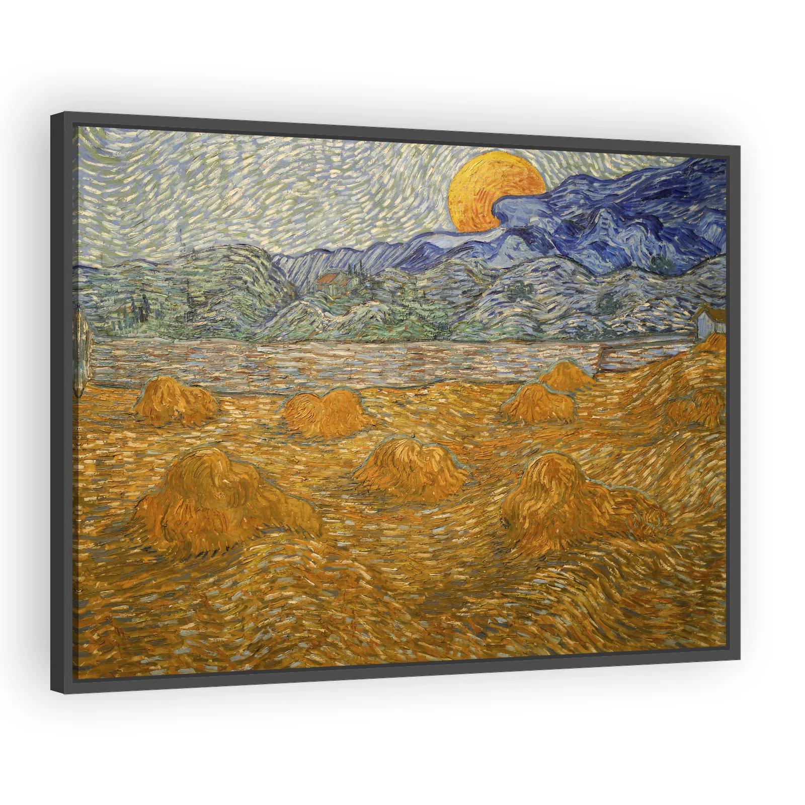 A luminous evening landscape by Vincent van Gogh (1889), capturing moonrise over harvested fields. Rich impasto, dynamic brushwork, and bold color convey mood and the artist’s empathy for rural life—a...