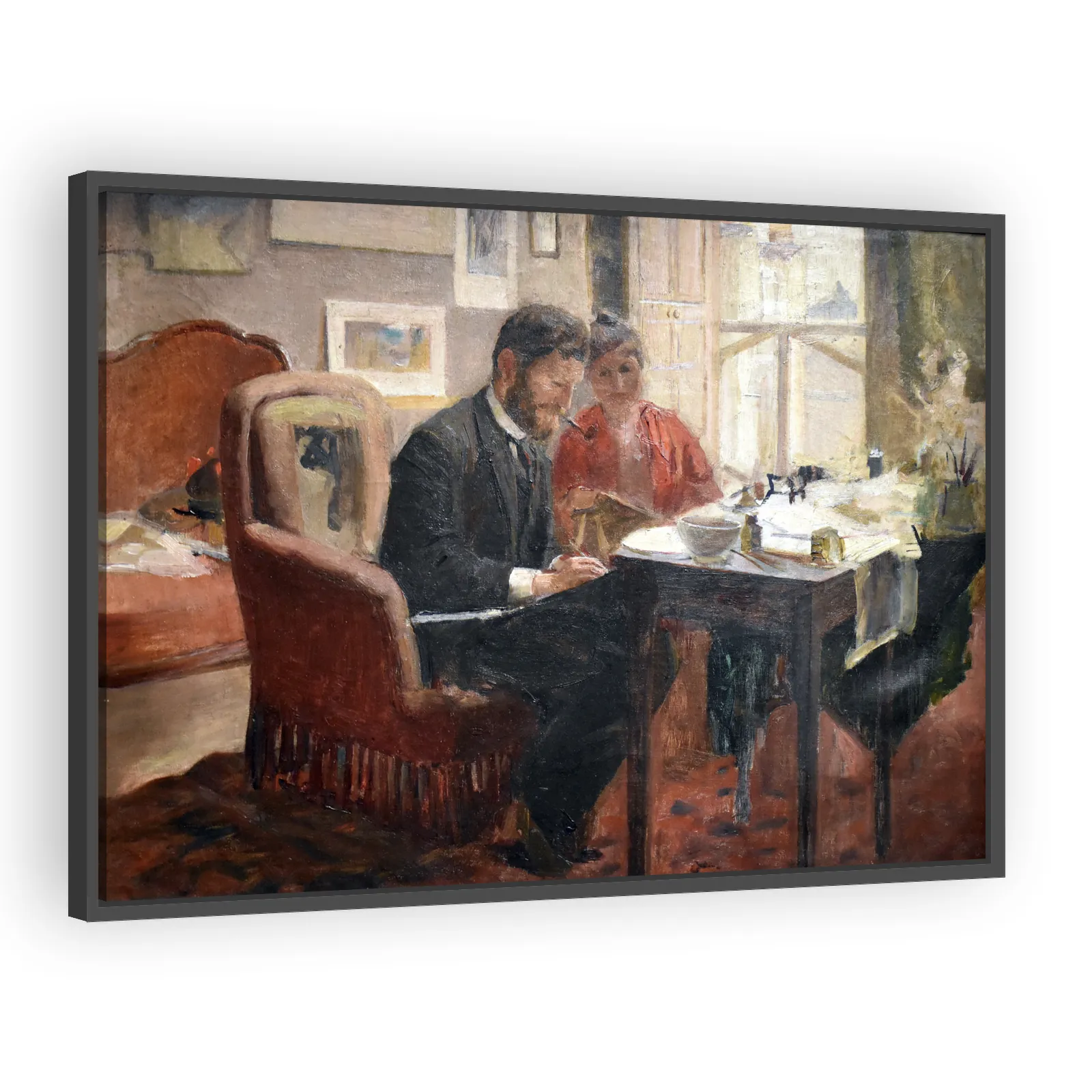 A reflective 1889 oil self-portrait by Alphonse Mucha showing the artist at work in his Paris apartment. Merging intimate studio observation with emerging Art Nouveau sensibilities, this picture captu...