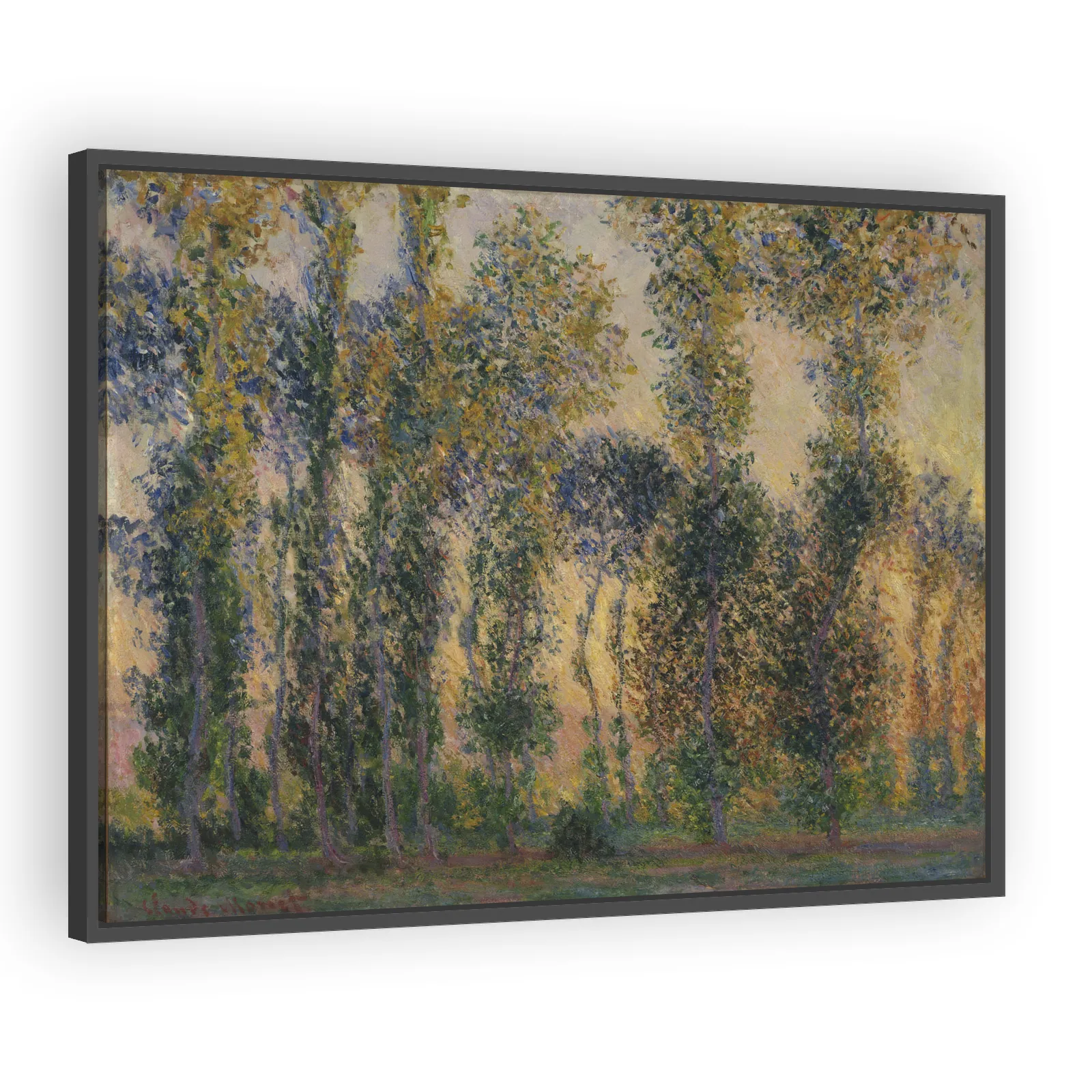 Claude Monet's Poplars at Giverny, Sunrise (1888) captures the shifting morning light across a stand of trees near his Giverny gardens. A luminous example of Impressionist technique, it appeals to col...