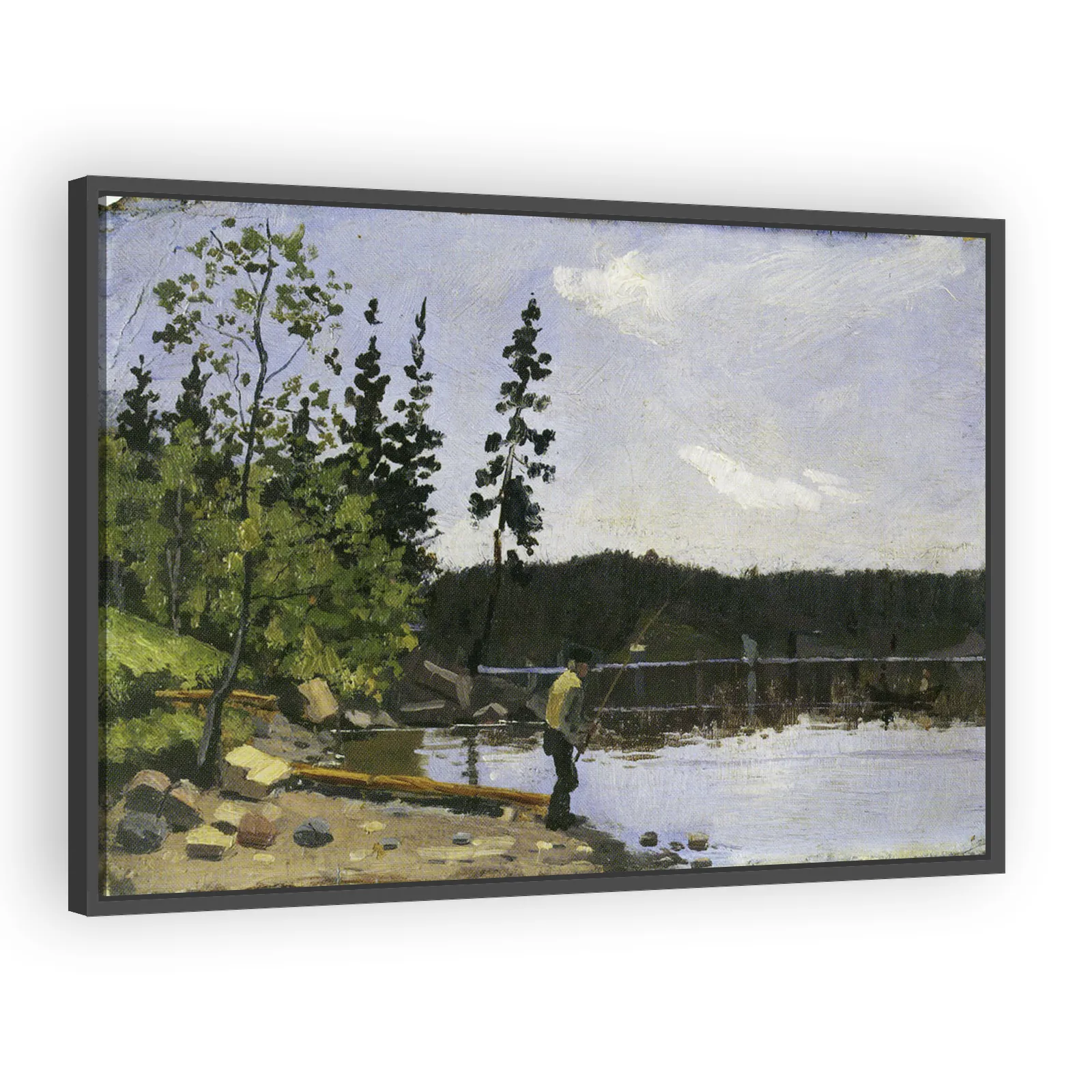 An intimate early work by Edvard Munch (1881), executed in oil on cardboard. The small-scale, atmospheric study captures a solitary fisherman at the shoreline, revealing Munch’s developing focus on mo...