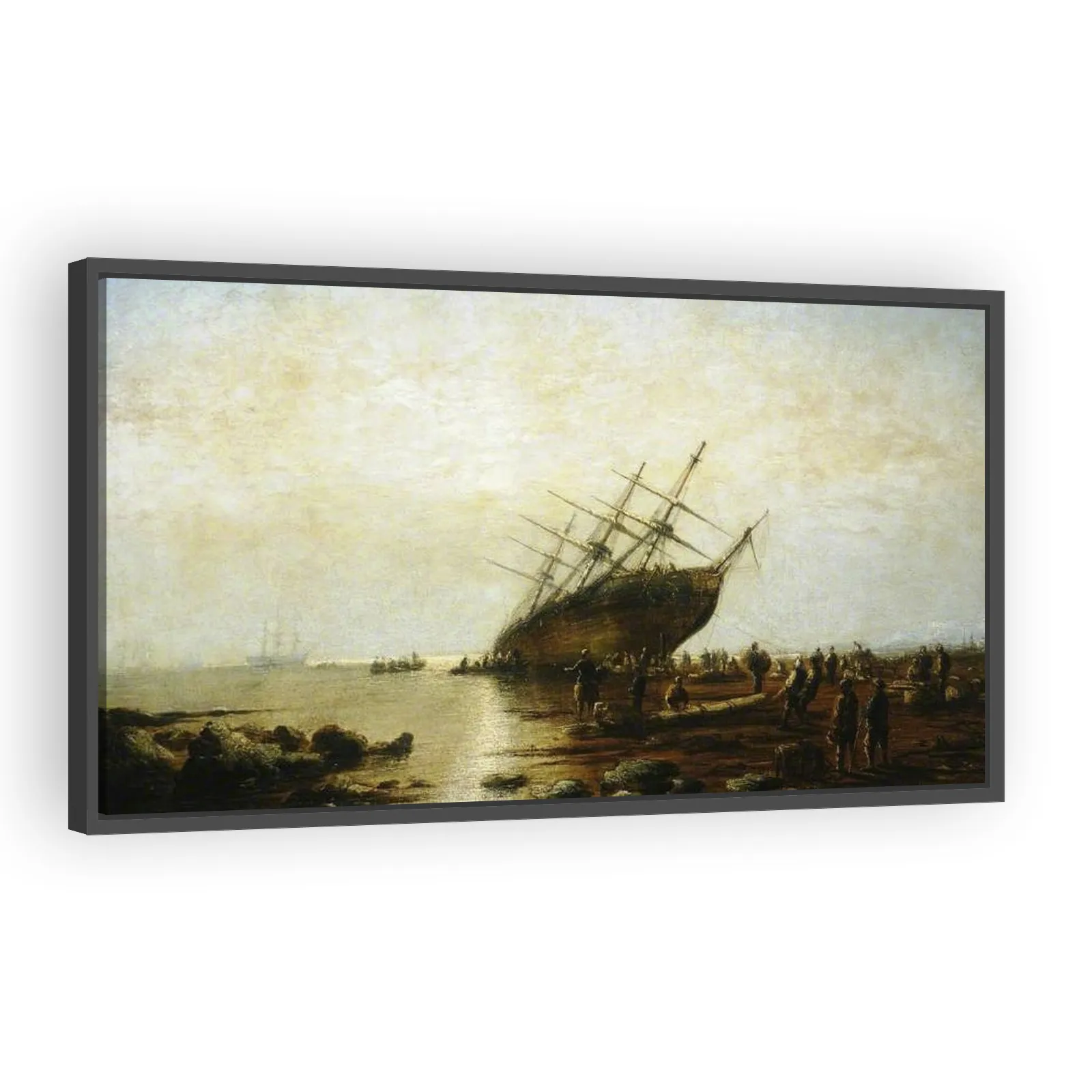 A compelling maritime scene from James Webb in the Sheffield Galleries and Museums Trust collection. 'Ship Aground' captures tension and atmospheric drama—an evocative study of sea, sky and human stru...