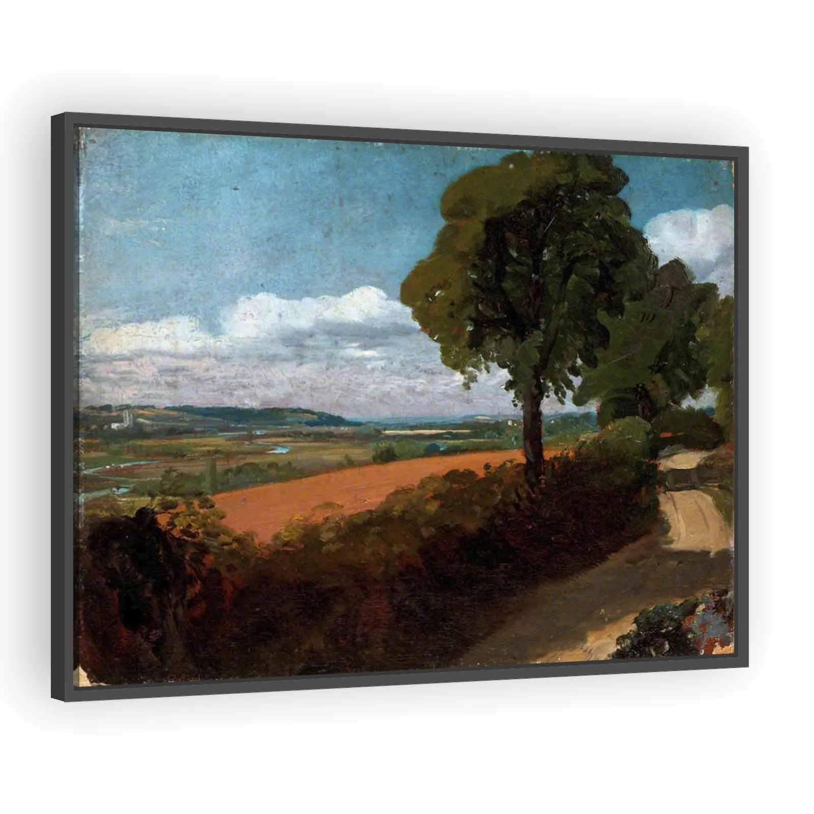 A quintessential John Constable landscape from 1810, capturing the tranquil Dedham Vale with luminous sky, intimate rural detail, and expressive brushwork—an evocative study of light, weather, and Eng...