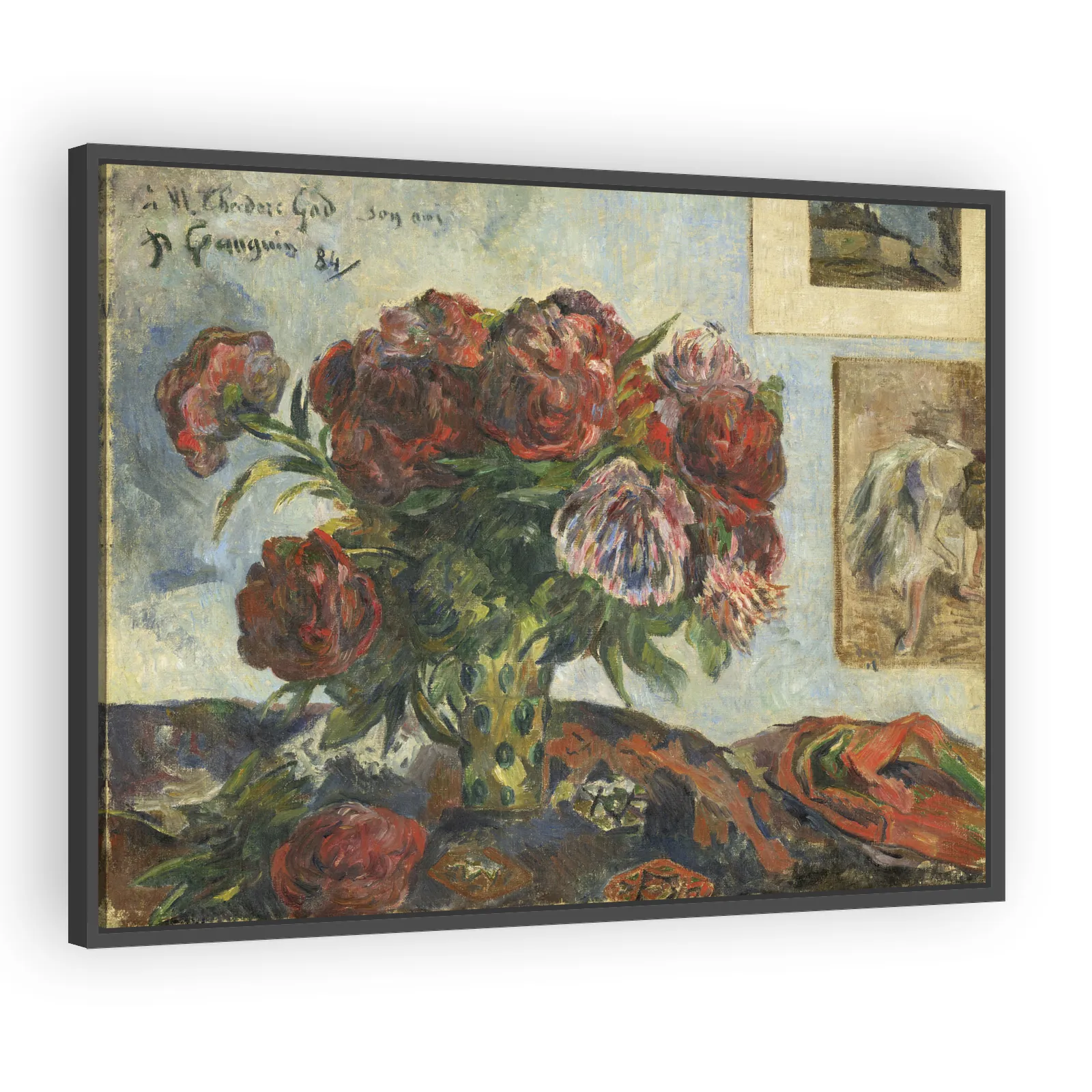 Paul Gauguin’s 1884 Still Life with Peonies blends bold color and expressive brushwork, bridging Impressionist observation and emerging Post-Impressionist sensibility—an intimate, decorative study tha...