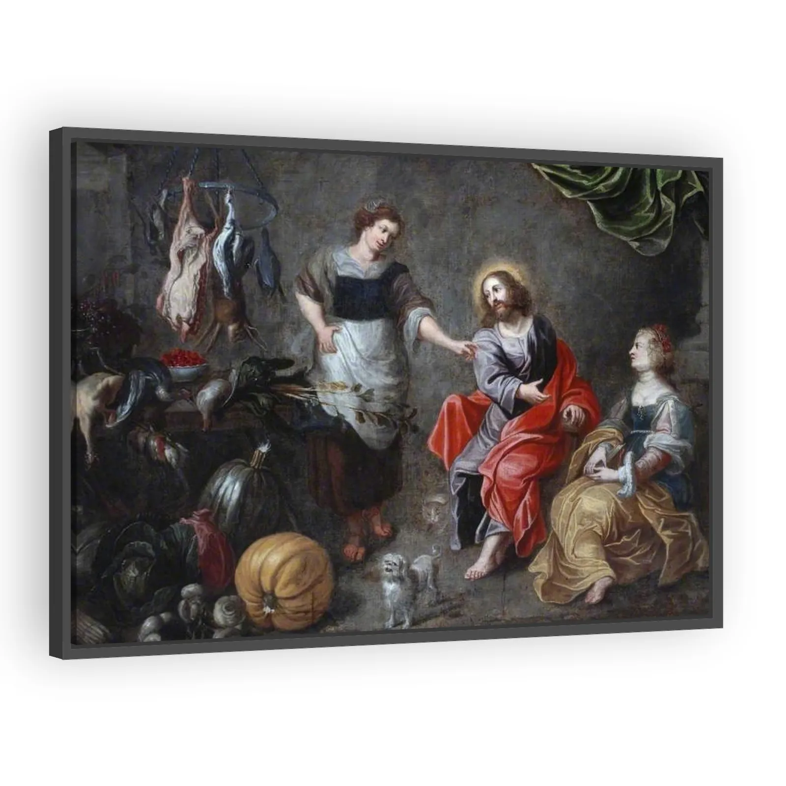 A striking Baroque depiction by Peter Paul Rubens, showing the biblical scene of Christ with Martha and Mary at Bethany. The composition combines dramatic gesture, luminous color, and emotional intima...