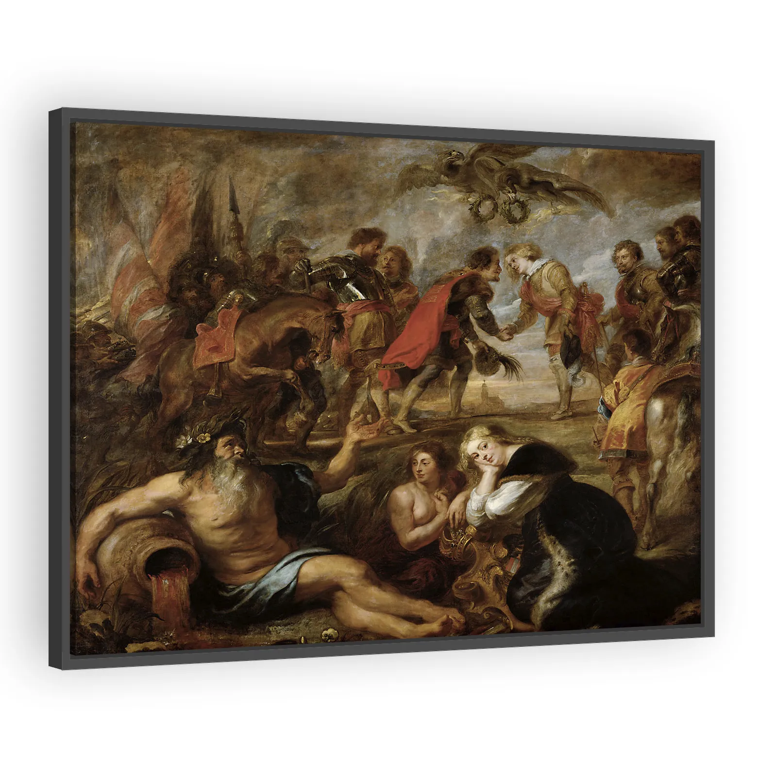 A triumphant Baroque history painting by Peter Paul Rubens (1634) depicting the post-battle meeting after the decisive Battle of Nördlingen. Vivid color, dynamic composition, and heroic figuration cel...