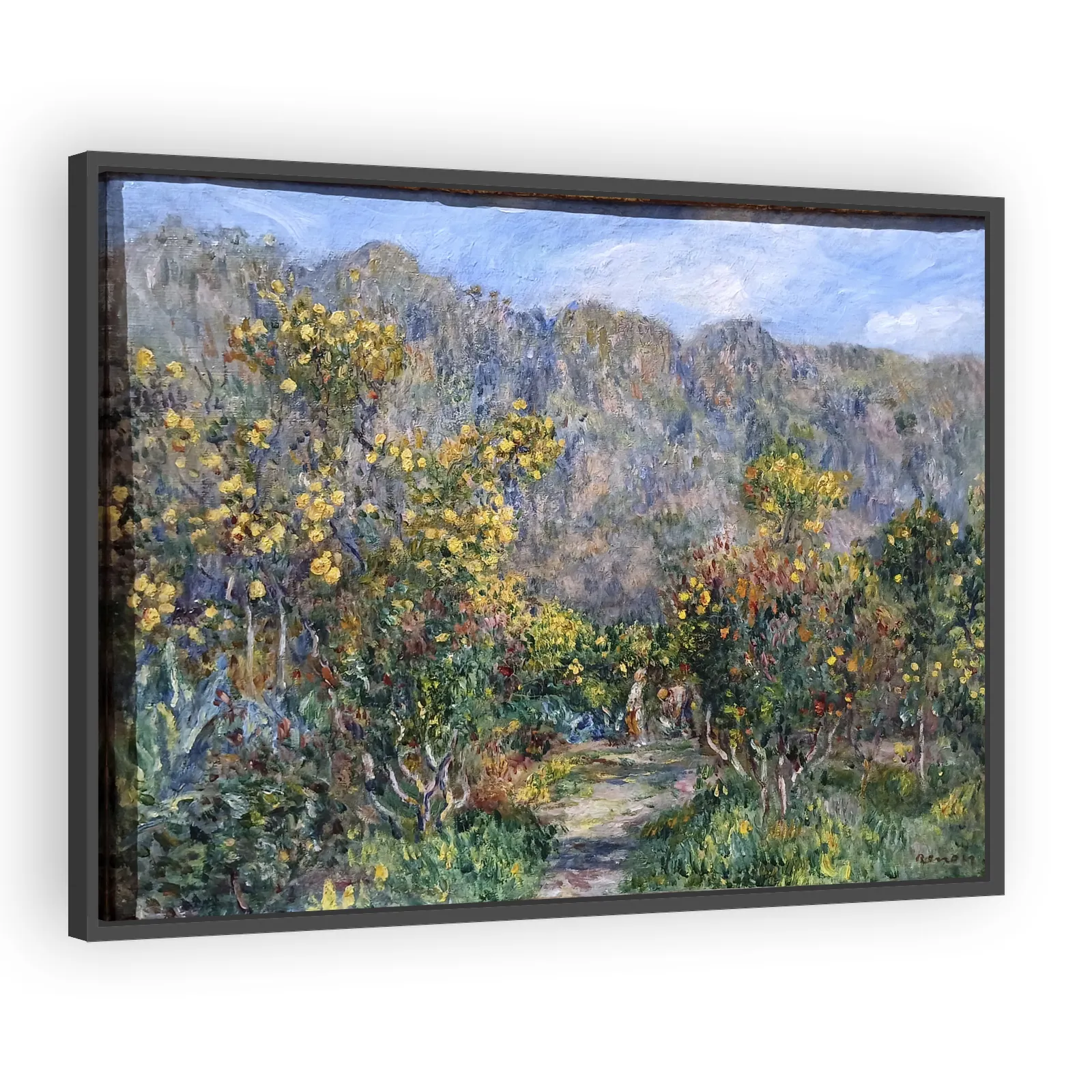 A luminous 1912 landscape by Pierre-Auguste Renoir, 'Landscape with Mimosas' showcases late Impressionist color and brushwork. Warm mimosas and sunlit foliage create a serene, decorative composition p...