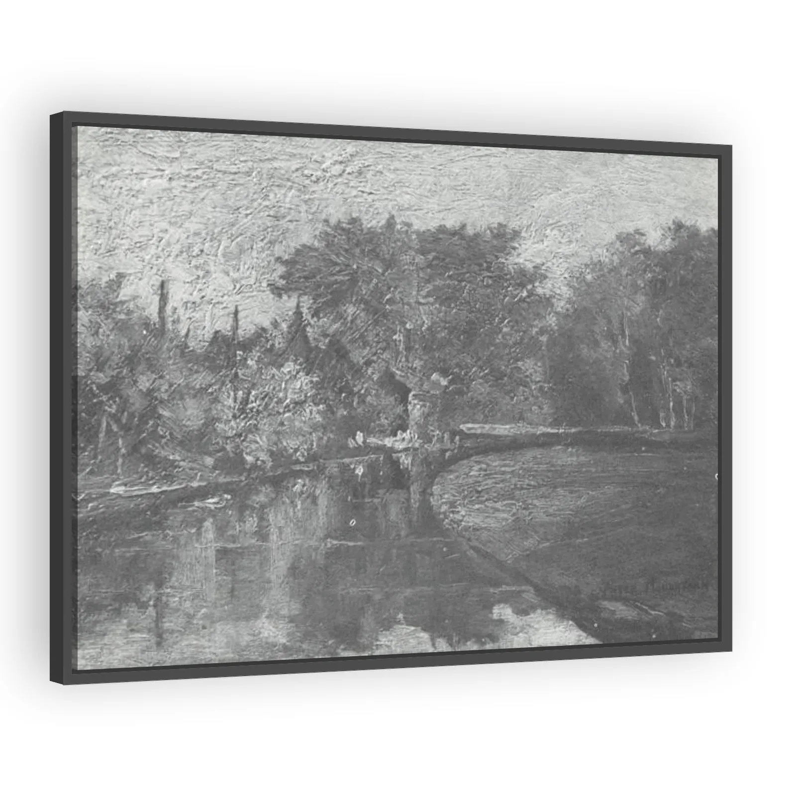 An evocative early landscape by Piet Mondrian (1895) showing a tranquil stream framed by trees. This work reveals Mondrian’s naturalistic roots and mastery of composition before his shift to abstract, geometric modernism.
