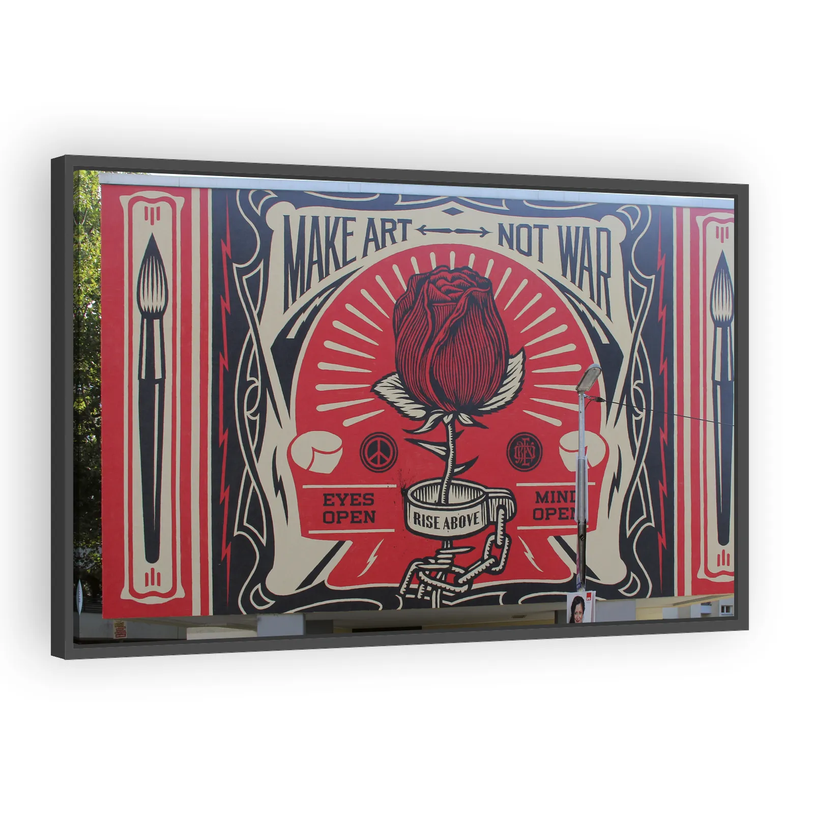 Shepard Fairey’s 2014 Kreuzberg mural 'Make Art Not War' turns a public wall into a bold call for creativity over conflict. Combining street-art techniques and politically charged iconography, the pie...