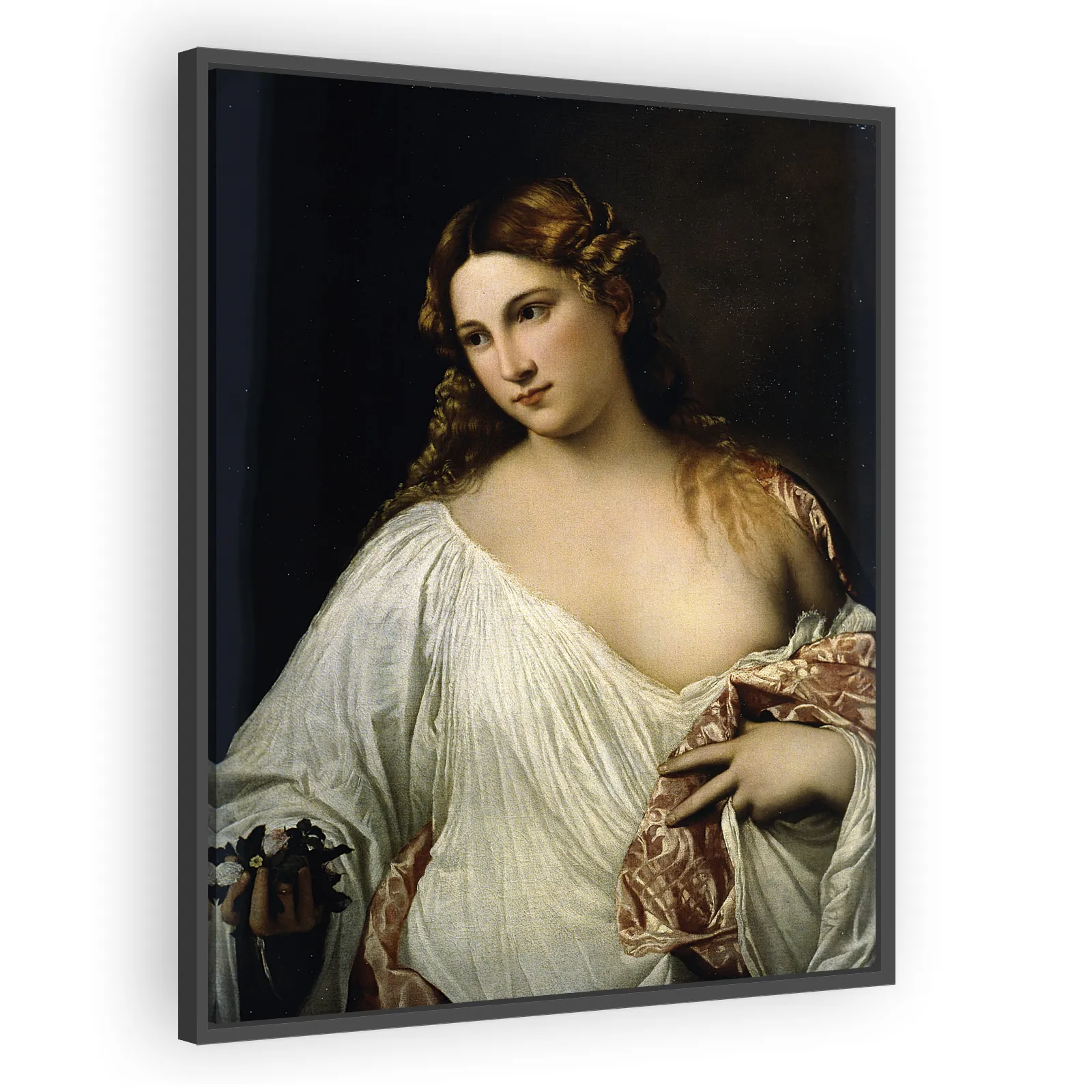 Titian’s Flora (1517) captures Venetian Renaissance sensuality and refined colorito. The portrait of a young woman entwined with flowers exemplifies Titian’s luminous palette, graceful composition, an...