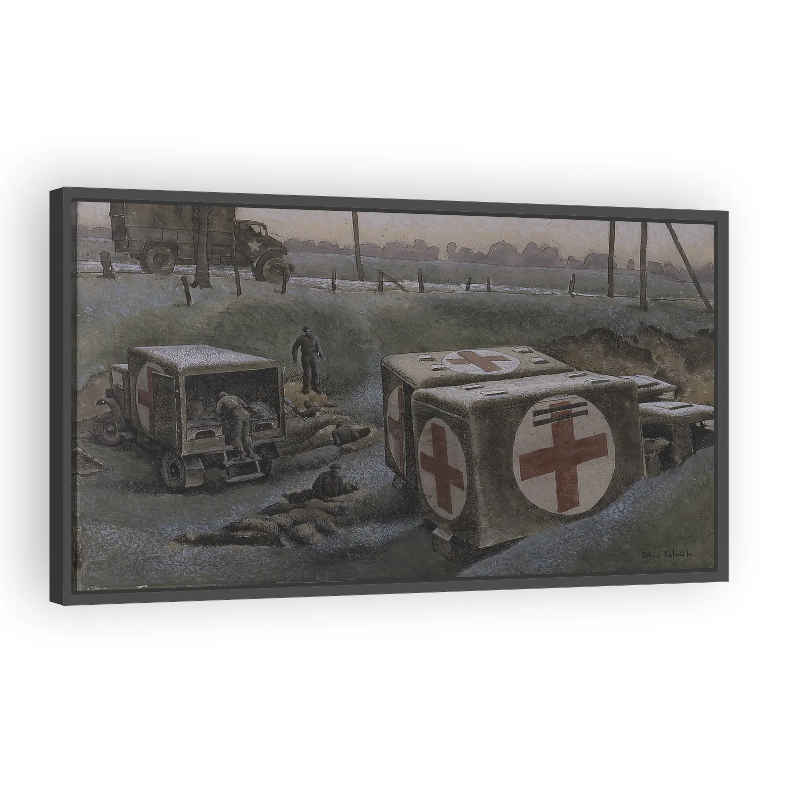 Alex Colville’s 1945 Casualty Clearing Post captures the quiet, tense aftermath of war with precise realism and restrained emotion. A compelling study in composition and memory that appeals to collect...