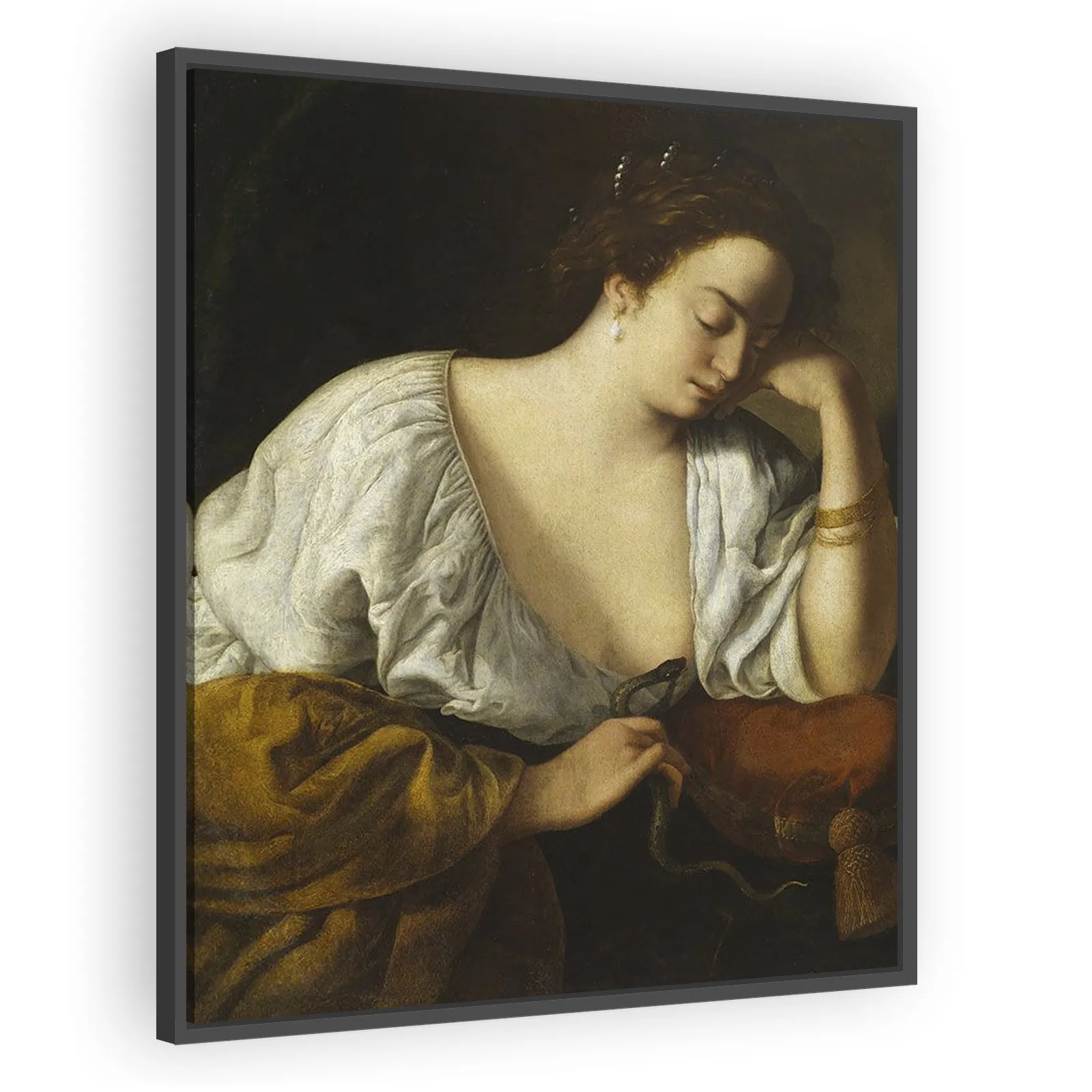 A powerful depiction of Cleopatra by Artemisia Gentileschi, combining Baroque drama, chiaroscuro, and psychological intensity. An evocative representation of agency and tragedy by one of the 17th cent...
