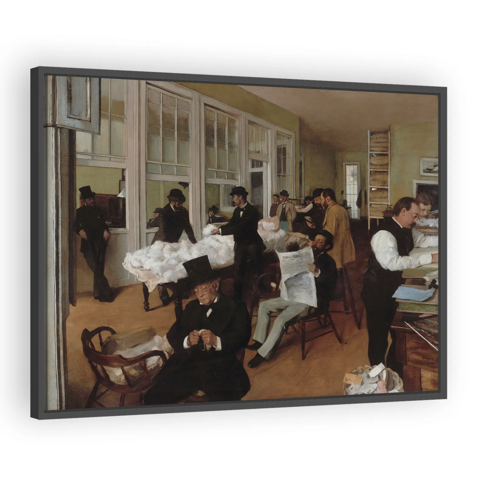 Edgar Degas's A Cotton Office in New Orleans (1873) captures a quiet, observational glimpse of commerce and family ties. The work blends realist detail with emerging Impressionist sensibilities—appeal...