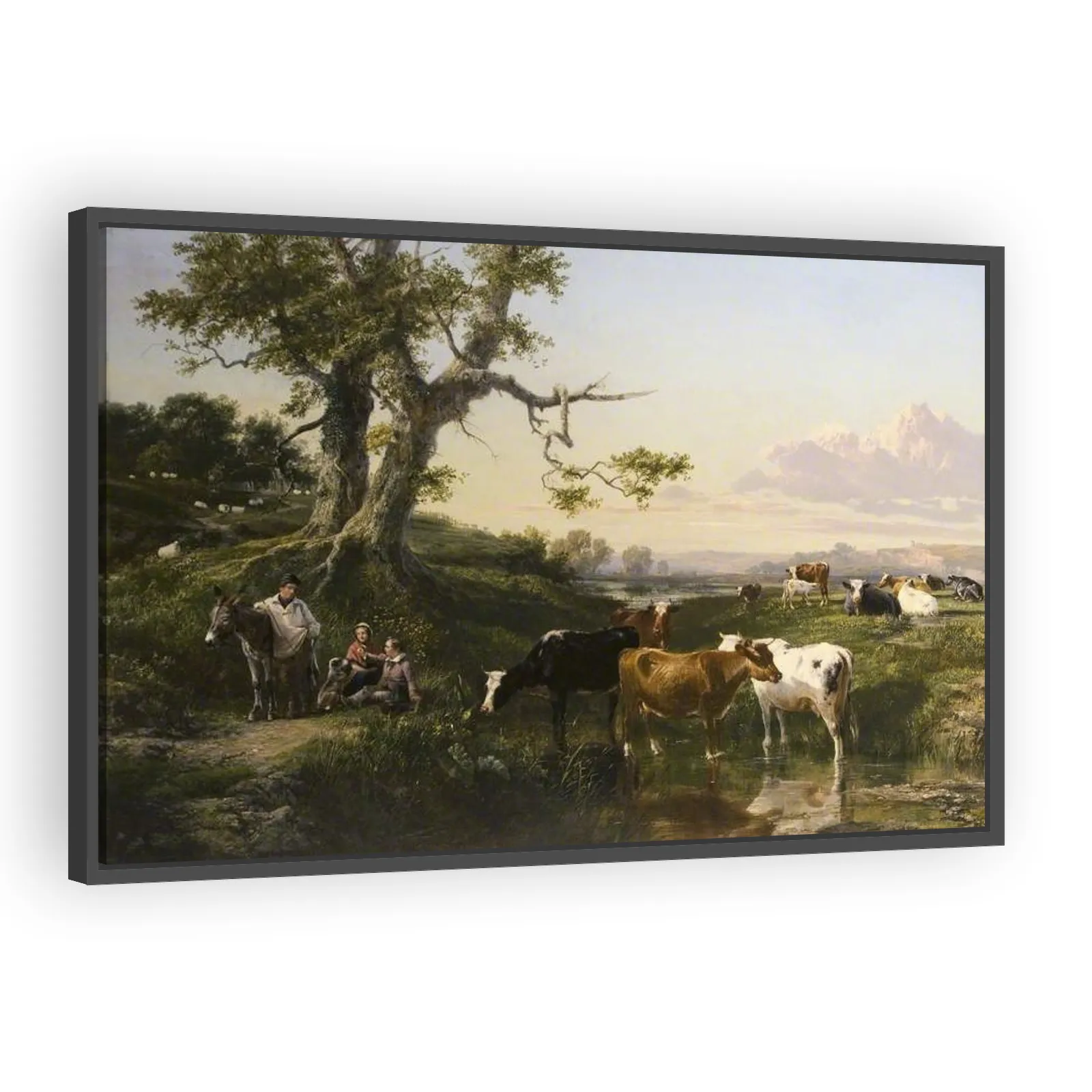 A tranquil 1858 vista by 19th‑century English landscape painter George Cole, capturing Surrey’s pastoral charm with careful handling of light, atmosphere, and rustic detail — an inviting study in the...