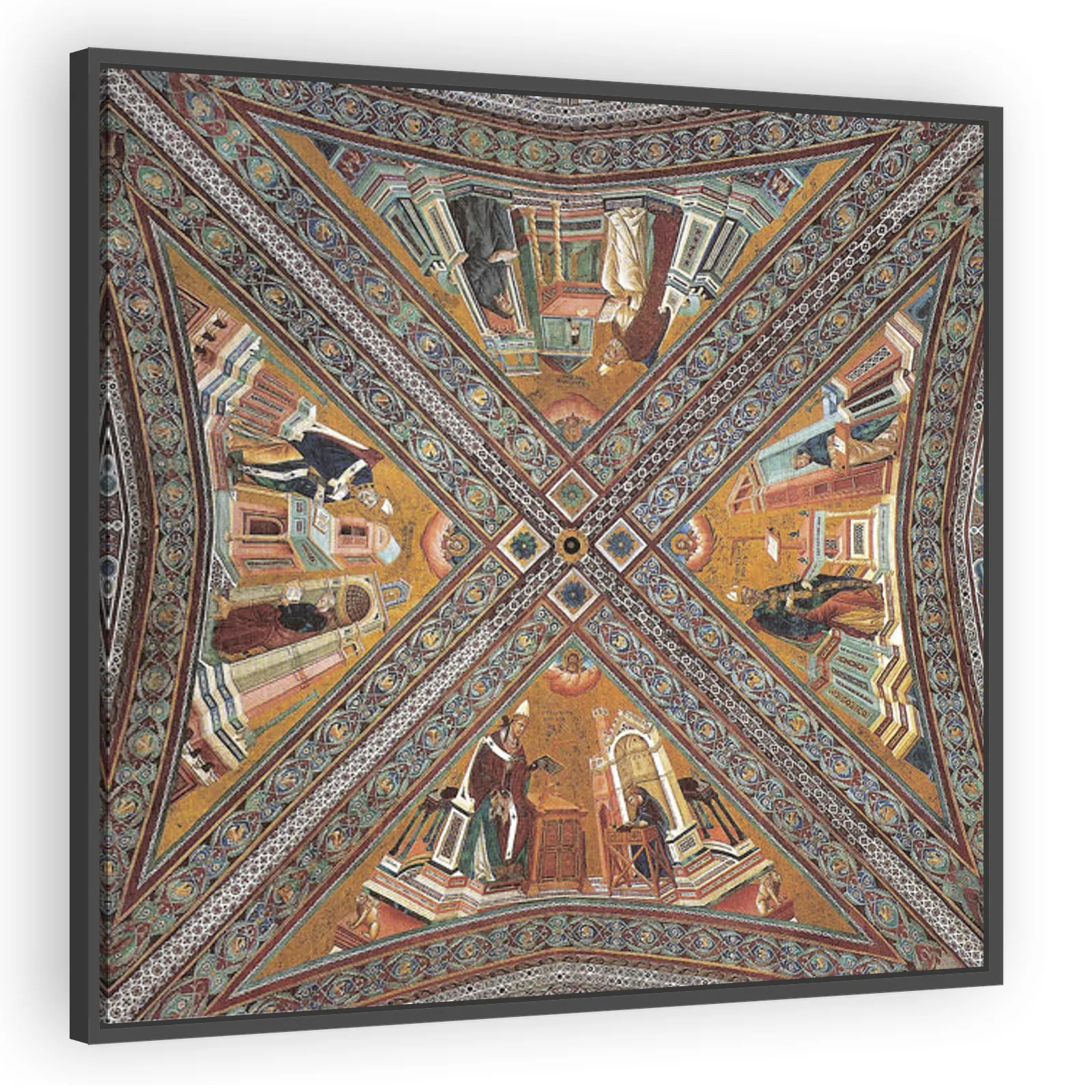 Giotto’s 1291 fresco 'Vault of the Doctors of the Church' crowns the Upper Basilica of San Francesco d'Assisi with early Proto‑Renaissance clarity and devotional gravitas, blending sculptural modeling...