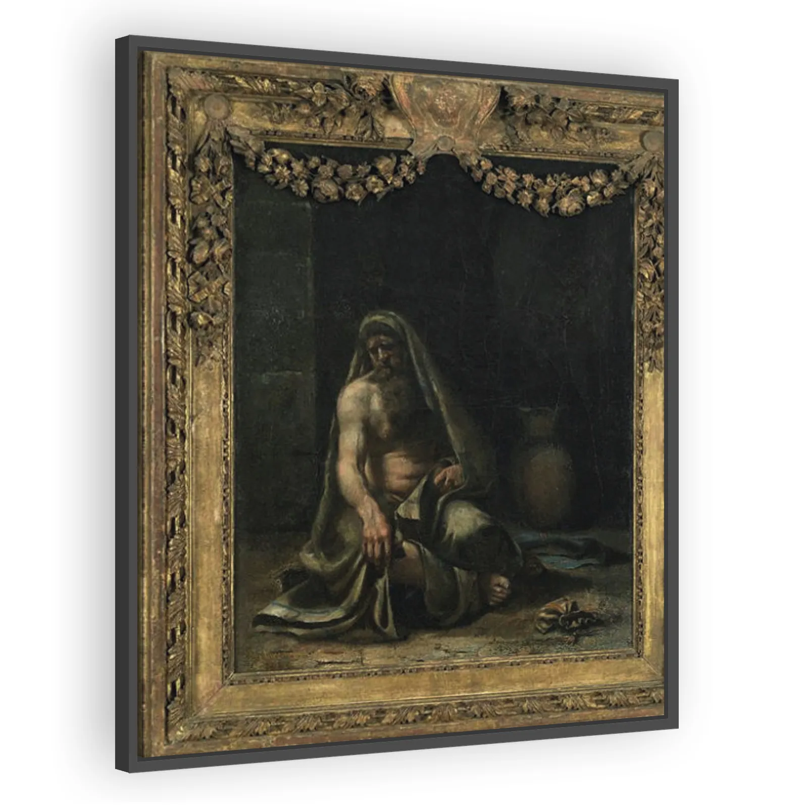 A dramatic 1844 oil by Gustave Courbet, portraying a pirate held by the Dey of Algiers. This early work fuses Romantic drama with emerging realist attention to presence and materiality, appealing to c...