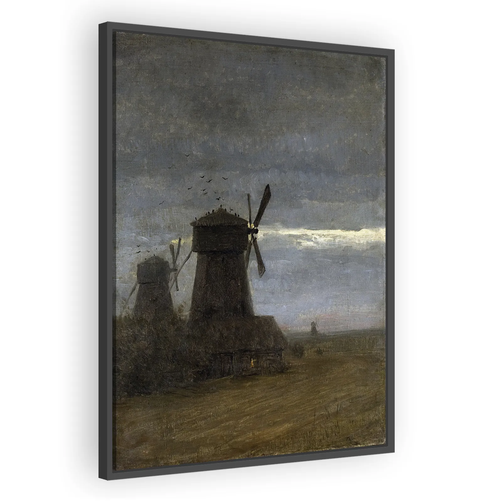 Лирический пейзаж Исаака Левитана: сумеречная сцена с ветряными мельницами, где тональная палитра и мягкое освещение создают атмосферу созерцания и меланхолии — идеальный выбор для ценителей русской п...