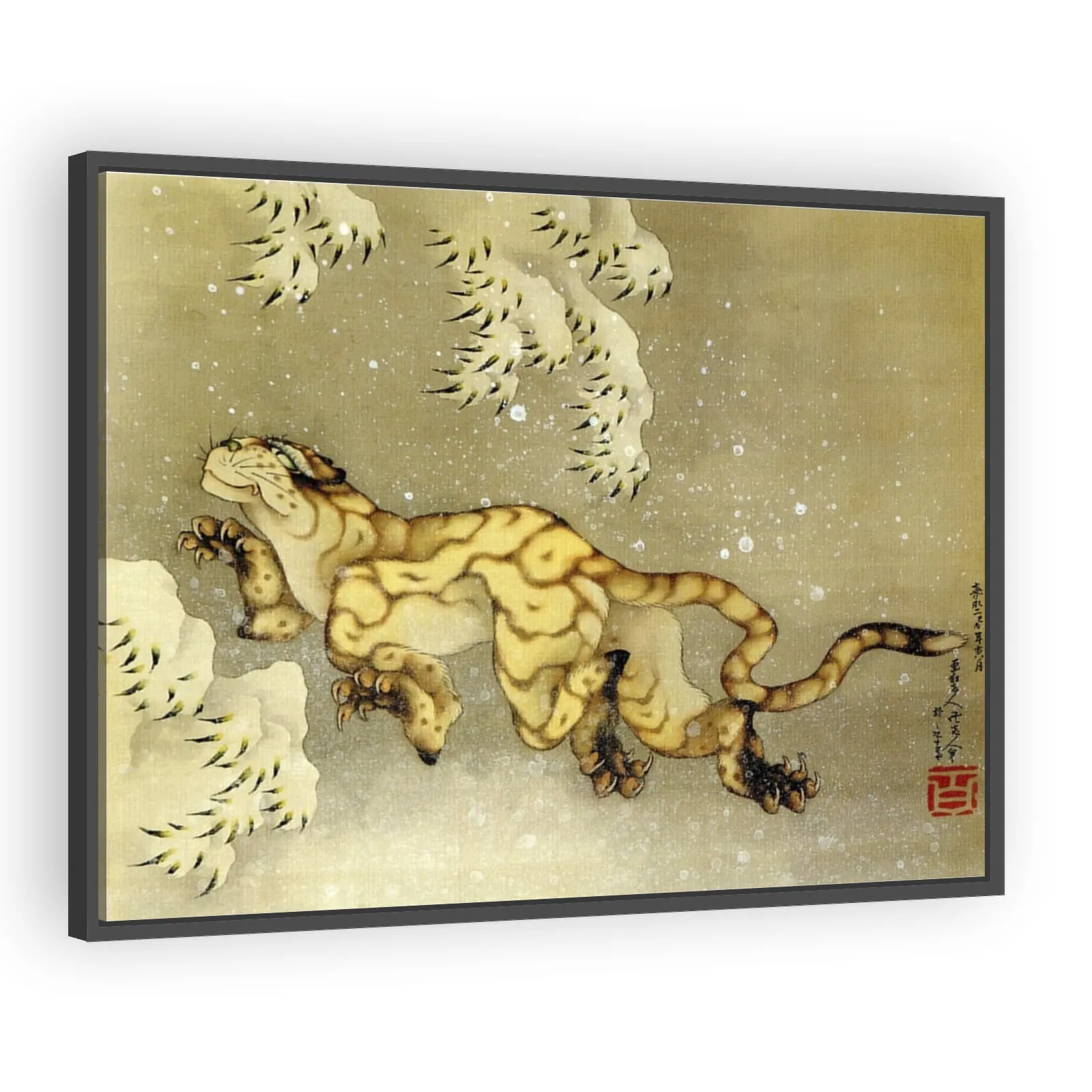 Katsushika Hokusai’s 1849 hanging scroll, Tiger in the Snow, pairs bold calligraphic brushwork with delicate color on silk. A late-career masterpiece that fuses Chinese ink tradition and Japanese natu...