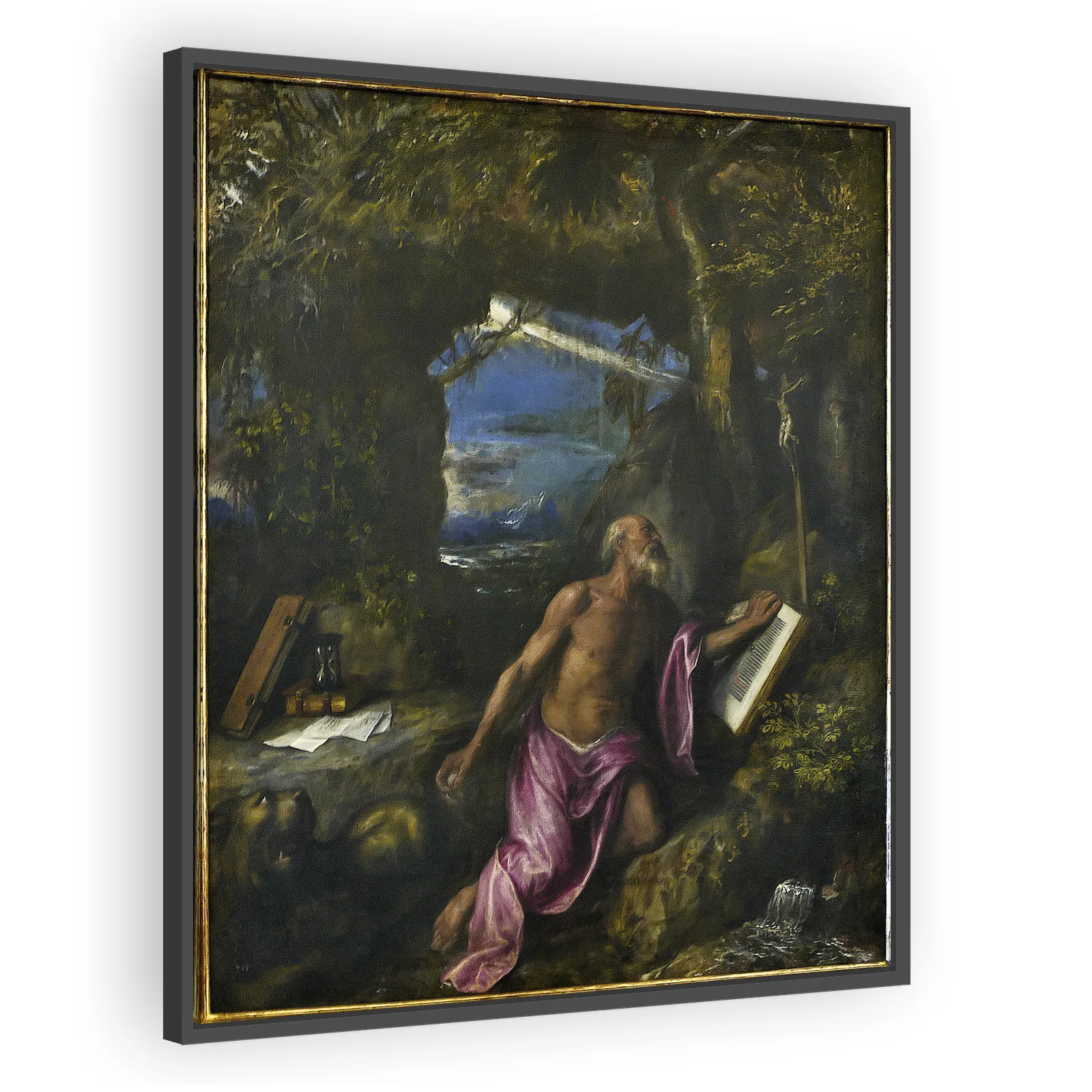 Late-period Titian depiction of Saint Jerome in the wilderness — a powerful Venetian-school oil on canvas from the Royal Monastery of San Lorenzo de El Escorial. Rich color, dramatic light, and contem...