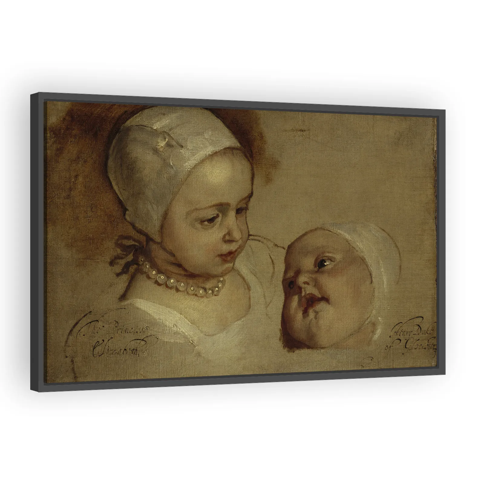 A refined Baroque double portrait by Anthony van Dyck showing royal sisters Princess Elizabeth and Princess Anne. Elegant costume, sensitive characterization, and courtly poise make this a compelling...