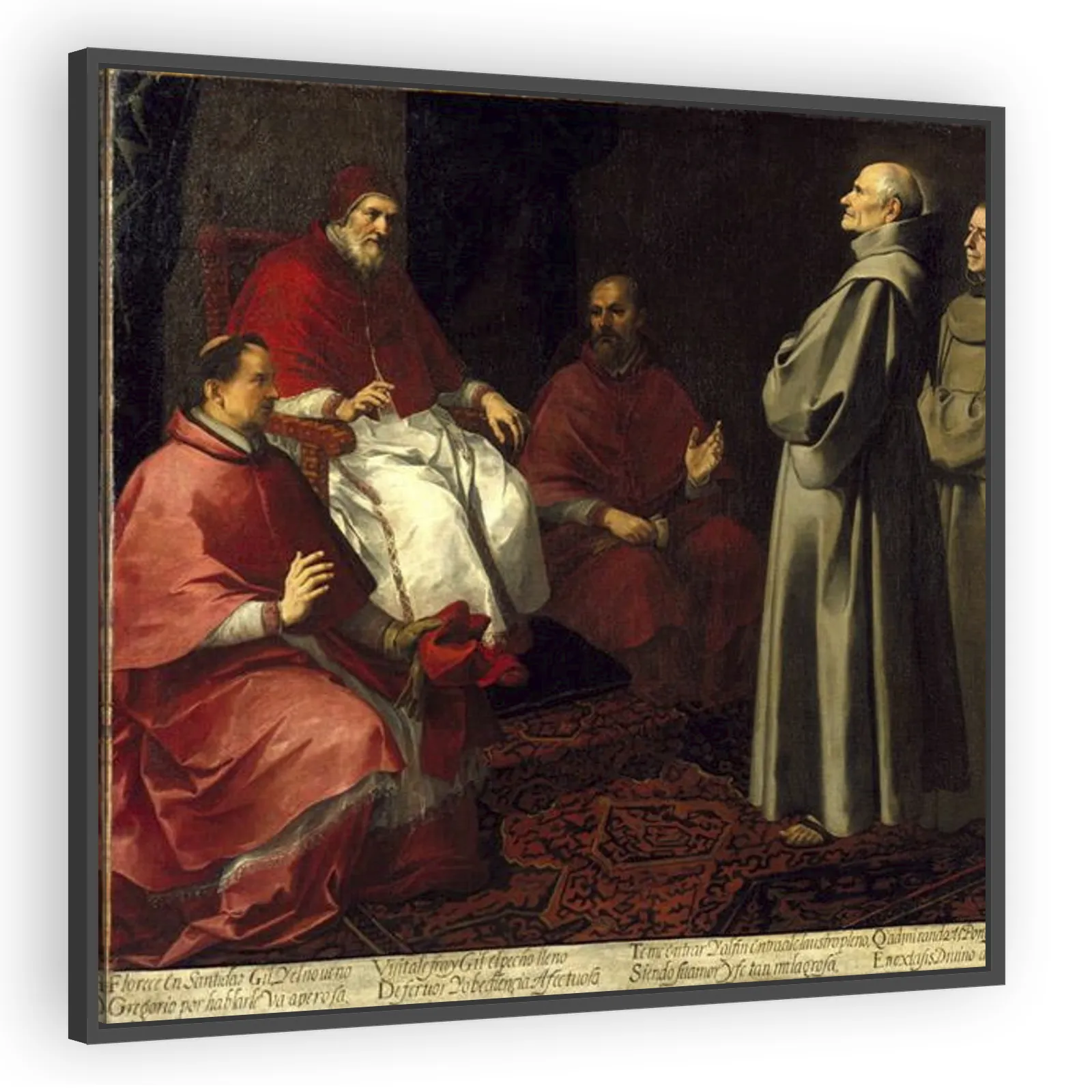 Murillo’s dramatic Baroque portrayal captures Blessed Egidius levitating before Pope Gregory IX. Rich chiaroscuro, devotional intensity, and graceful composition make this a striking example of 17th-c...