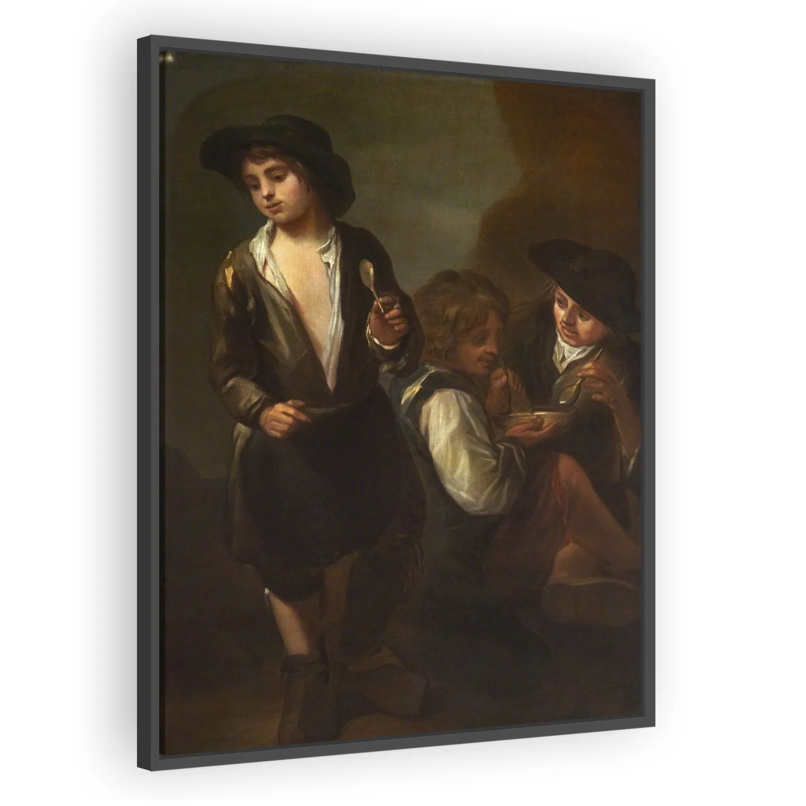 A tender, kinetic scene by Murillo portraying street children sharing a meal. Combining Baroque light, warm palette, and empathetic realism, this left panel captures 17th‑century Seville’s social cont...