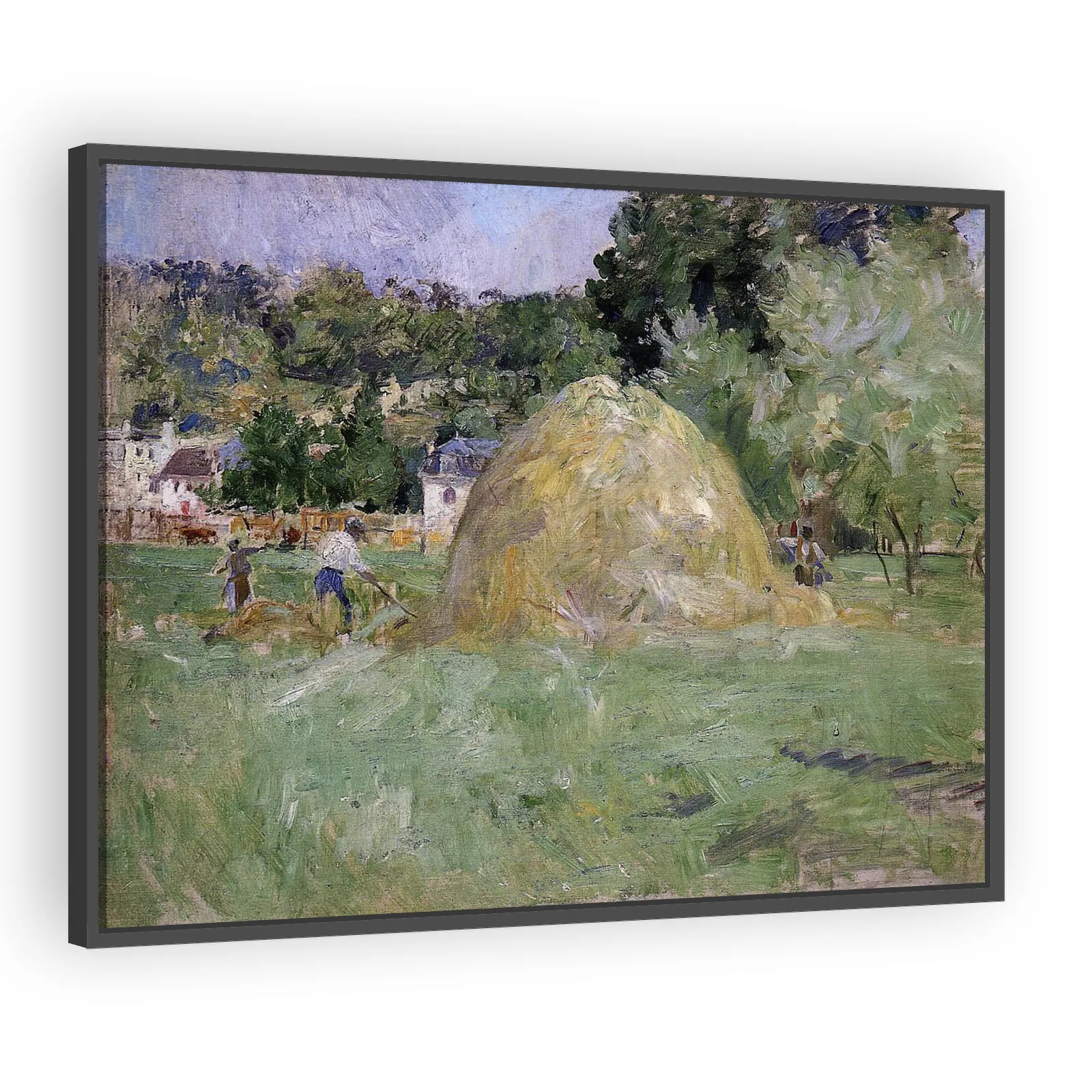 An 1883 Impressionist landscape by Berthe Morisot, capturing a sunlit haystack scene in Bougival with loose brushwork, airy color, and intimate observation. Housed at the Musée Marmottan Monet.