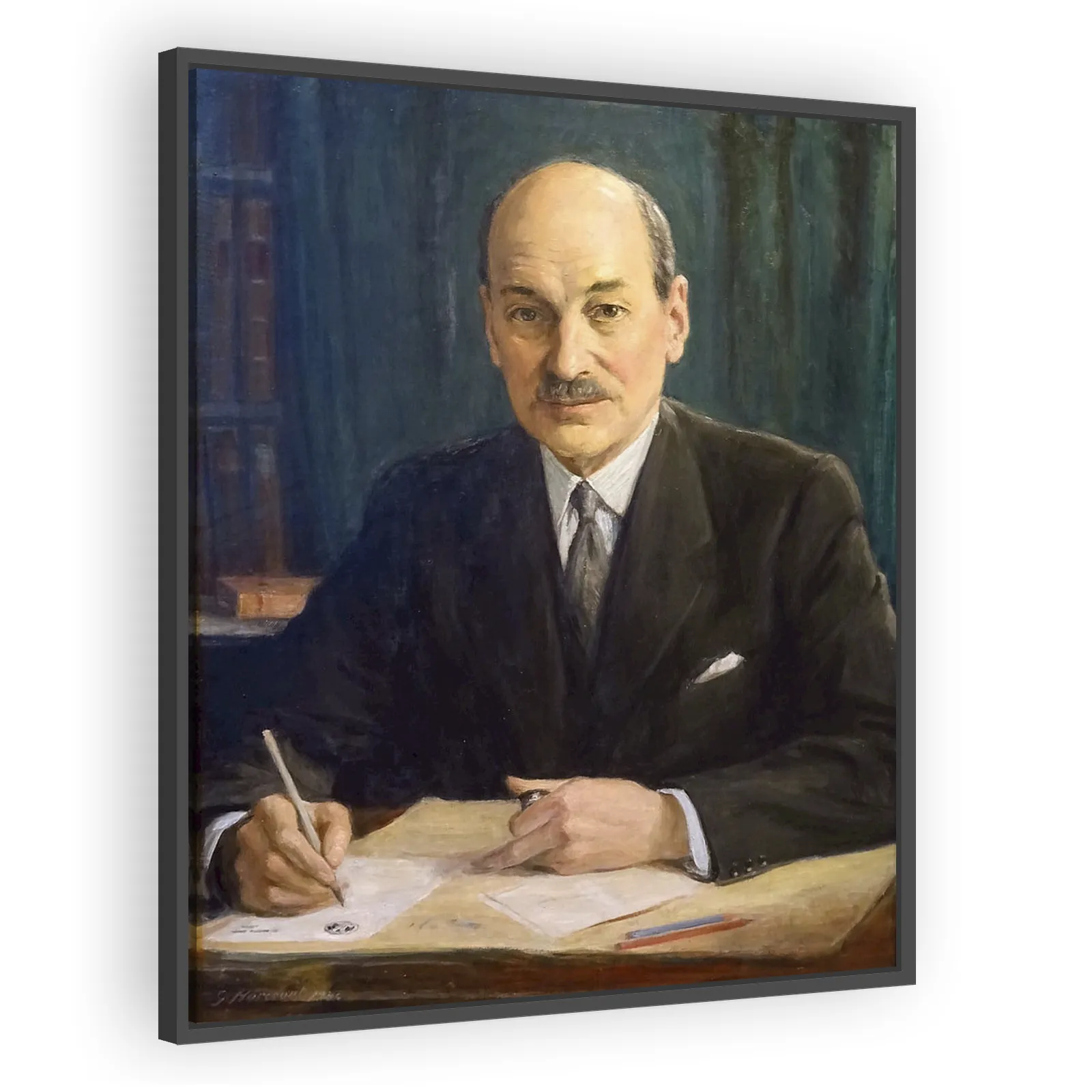 A dignified 1946 portrait by George Harcourt capturing postwar statesman Clement Attlee with calm authority. Rendered in oil on canvas, the work combines traditional portraiture with subtle psychologi...