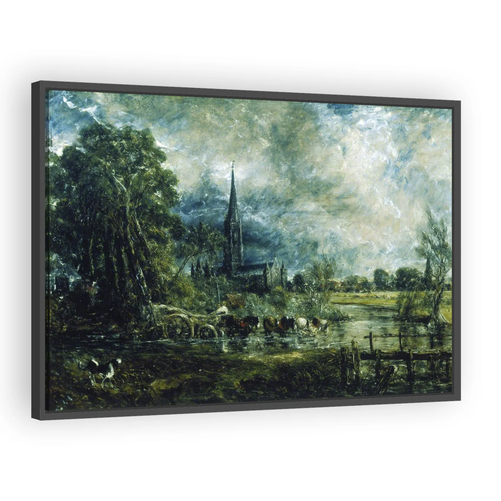 John Constable’s 1830 view captures Salisbury Cathedral rising above sunlit meadows, a quintessential example of English landscape painting. Evocative skies, naturalistic detail, and atmospheric light...