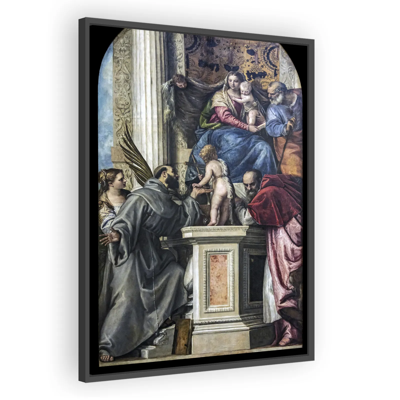 A luminous 1562 altarpiece by Paolo Veronese, showcasing Venetian colorito and grand compositional drama. The Madonna and Child are surrounded by saints in a theatrical, richly hued setting — an exemp...