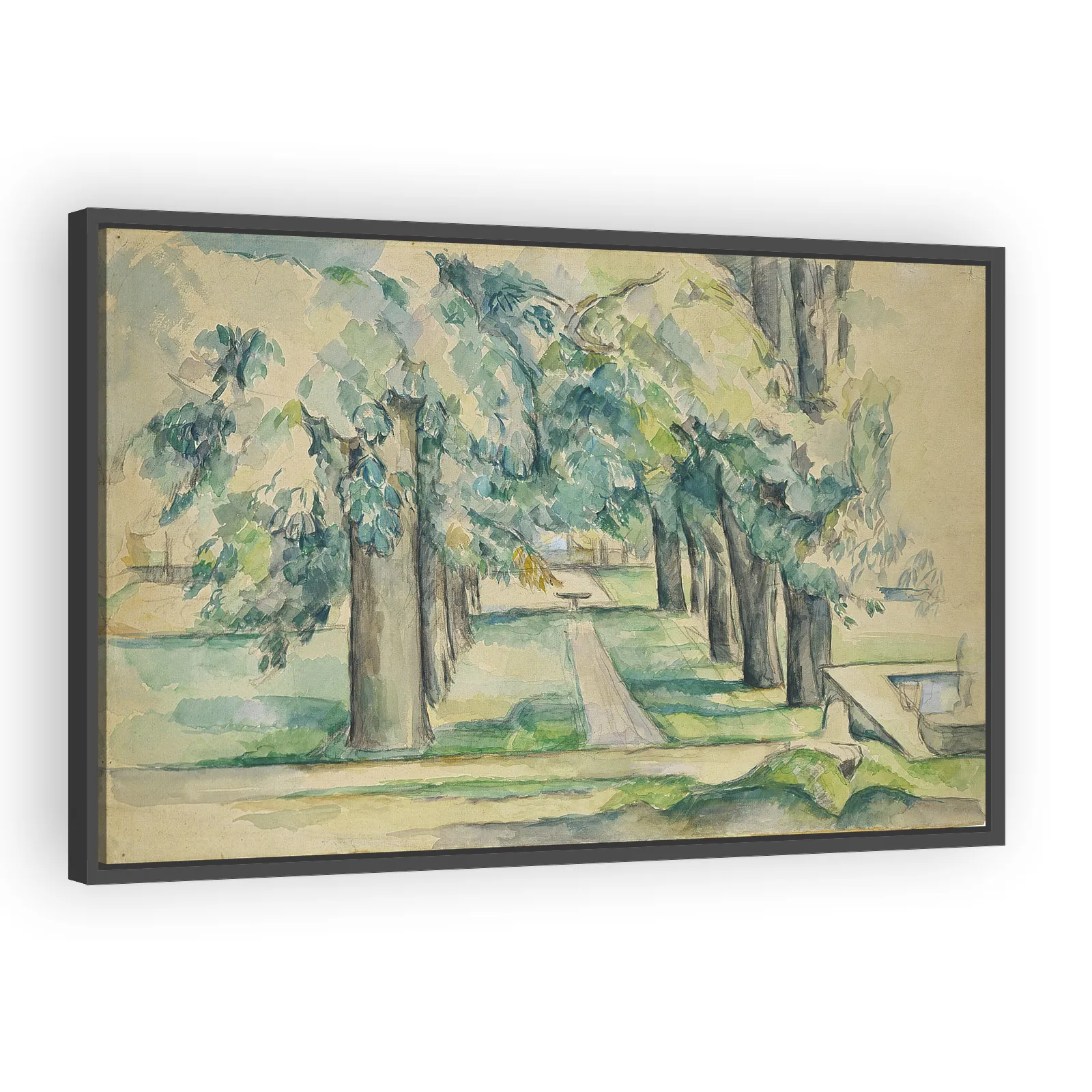 A luminous 1884 Cézanne landscape from his family estate at Jas de Bouffan, capturing ordered rows of chestnut trees with structural brushwork and subtle color modulation — a pivotal work linking Impr...
