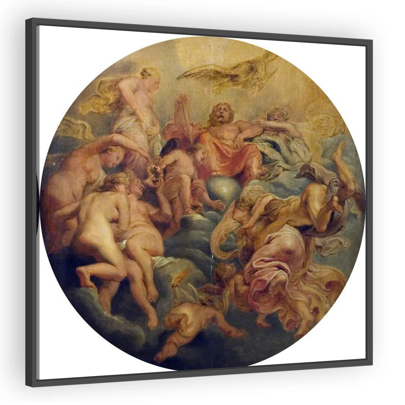 A dynamic Baroque depiction by Peter Paul Rubens, portraying Mercury escorting Psyche toward Olympus. Celebrated for its dramatic movement, rich color and classical subject, this work appeals to colle...